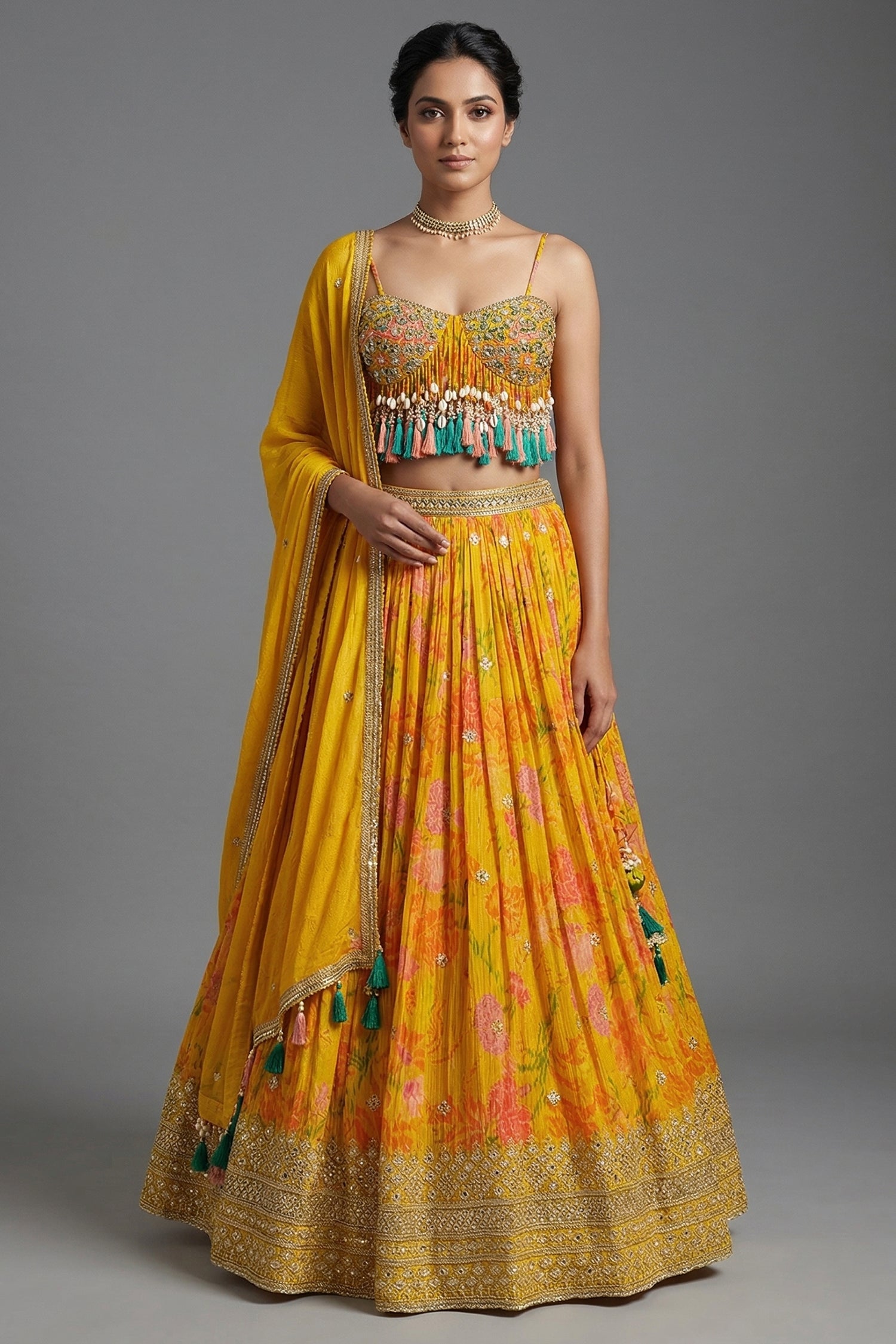 Amber Yellow Mustard Organza Printed Lehenga Set