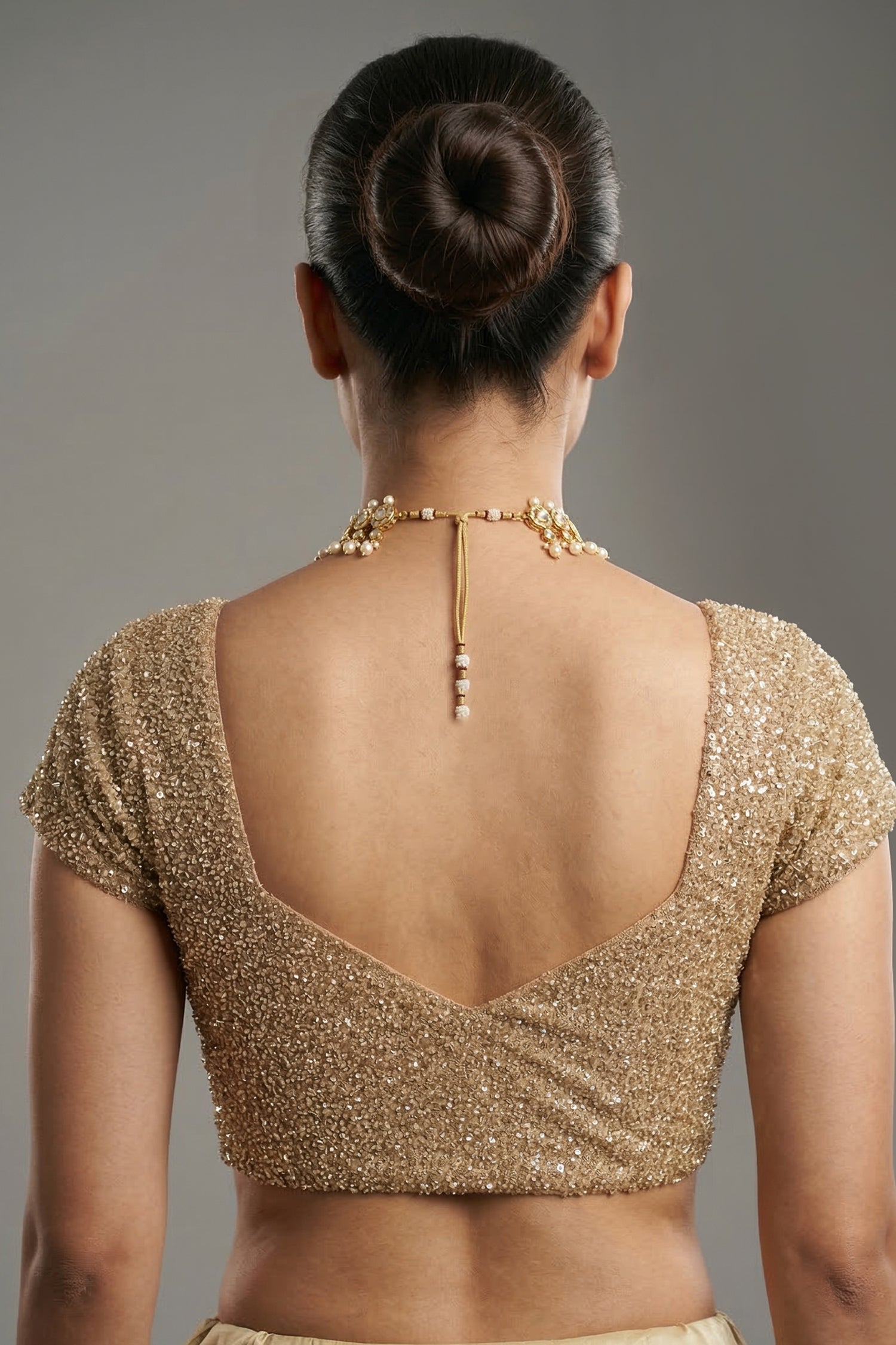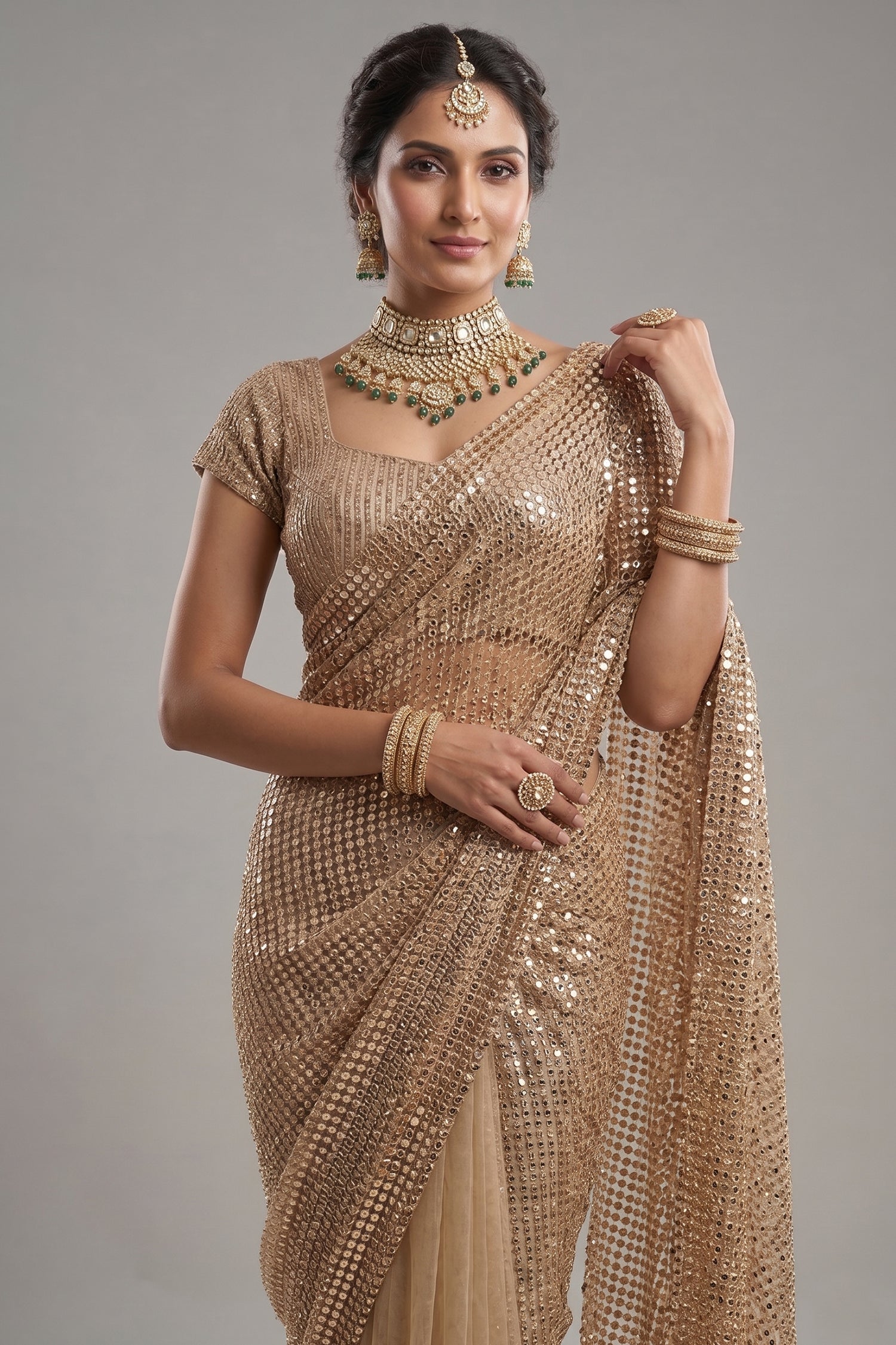 Since the saree and blouse are a monochrome Beige, avoid gold jewelry which can "wash out" the color. Instead, opt for Emerald Green or Ruby Red Victorian-style jewelry. The deep contrast against the neutral beige creates a royal, high-contrast look that photographs beautifully,Never use a standard safety pin on the "Stitched Sequin" pallu half; it can catch the sequins and tear the fabric. Always use beaded safety pins or place a small piece of matching cello-tape over the pin's coil to prevent the sequins from getting stuck,Create a slight "beehive" or "pouf" at the crown and pin the front sections back tightly. Let the rest of the hair fall in defined "Barrel Curls" only at the very ends. This keeps the hair away from the blouse's heavy work while still giving you the "length" of an open hairstyle.