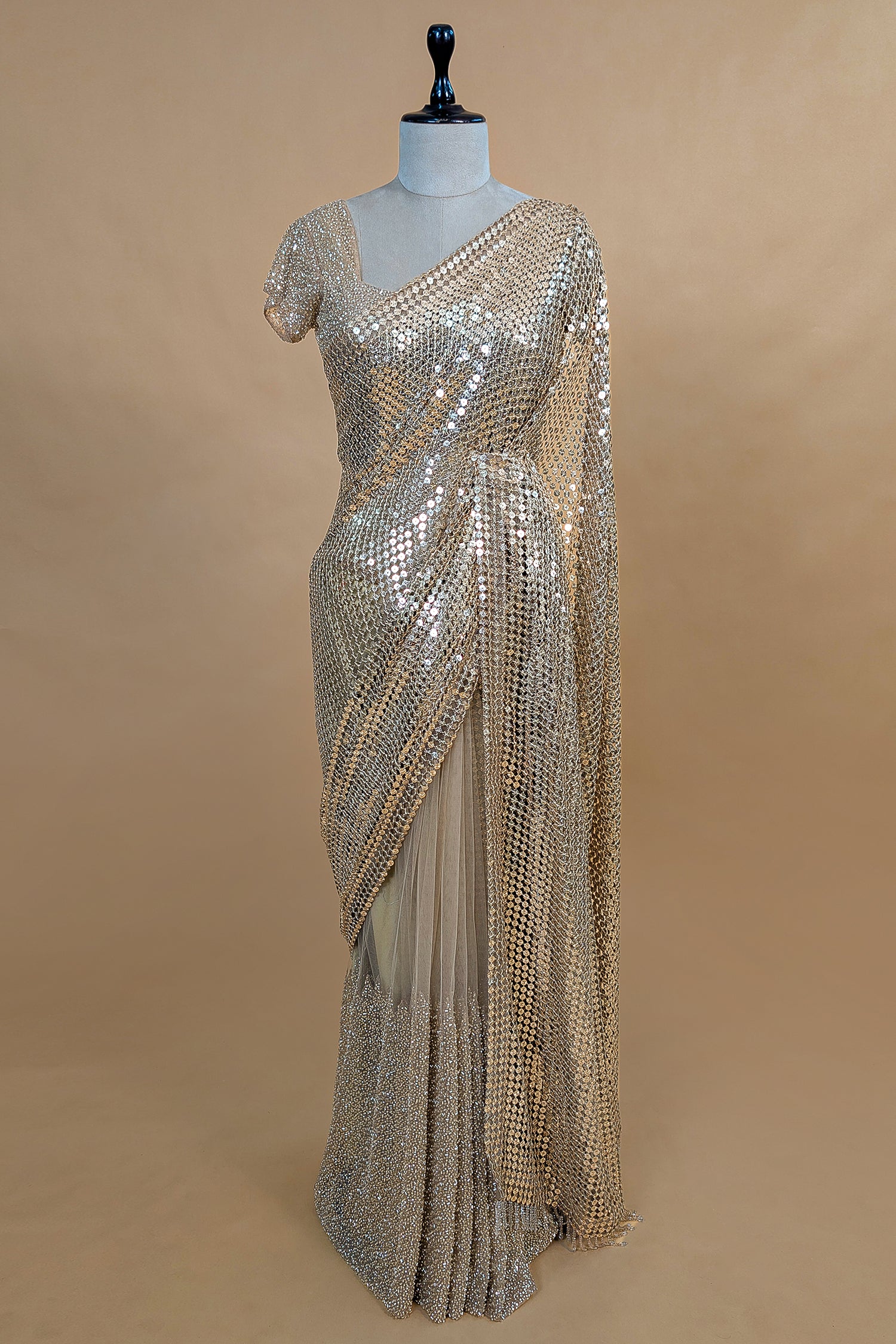 This sophisticated Beige Net saree features a unique "half-and-half" construction that blends two distinct artisanal textures for a truly modern aesthetic. The lower half (skirt) is meticulously hand-worked with a mix of shimmering sequins and precise cutdana in intricate floral patterns. In contrast, the pallu half is designed with densely stitched, all-over sequins that create a high-shine, liquid-gold effect when draped over the shoulder. The ensemble is paired with a matching designer readymade blouse that features a plunging sweetheart neckline and elegant full-length sleeves. Every inch of the blouse and the saree's scalloped border is adorned with coordinated hand-embroidery, ensuring a luxurious and consistent look throughout. Designed for grand evening celebrations, this piece offers a perfect balance of delicate net transparency and opulent metallic shimmer.
