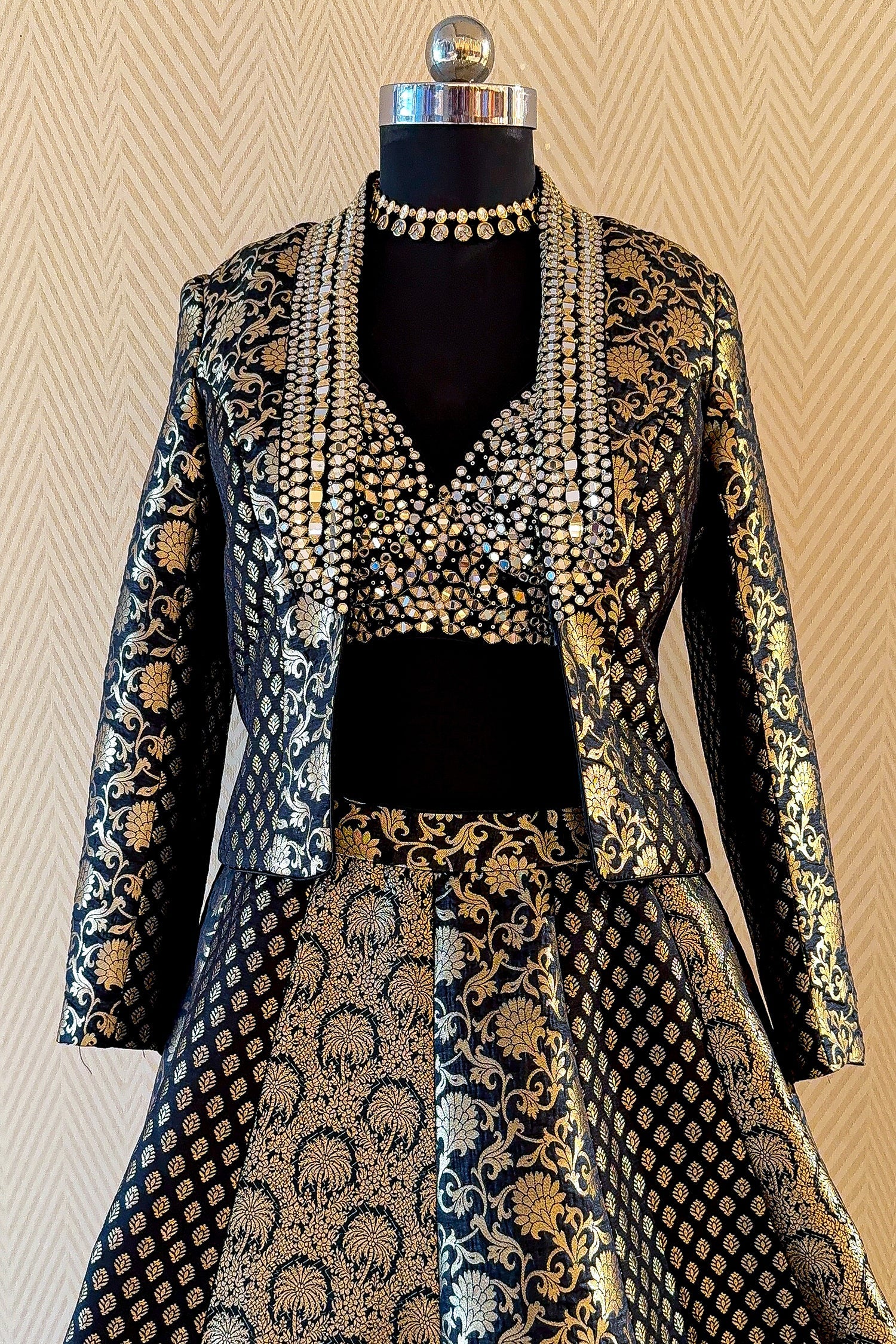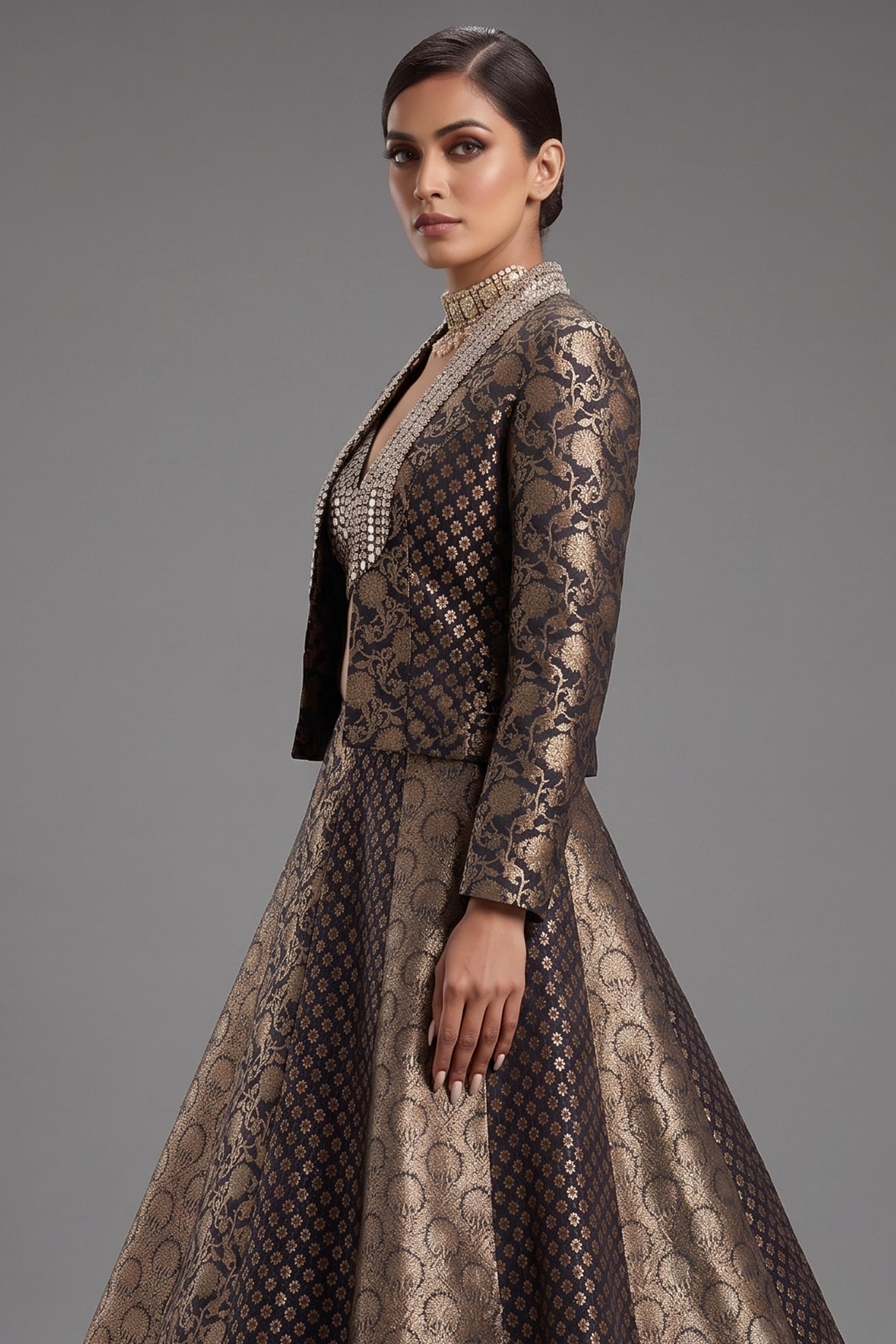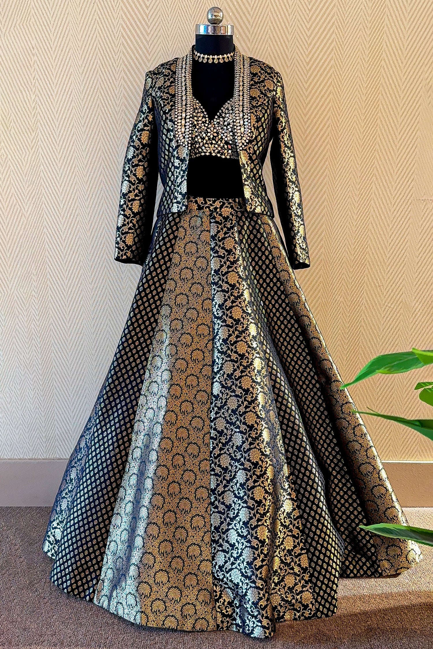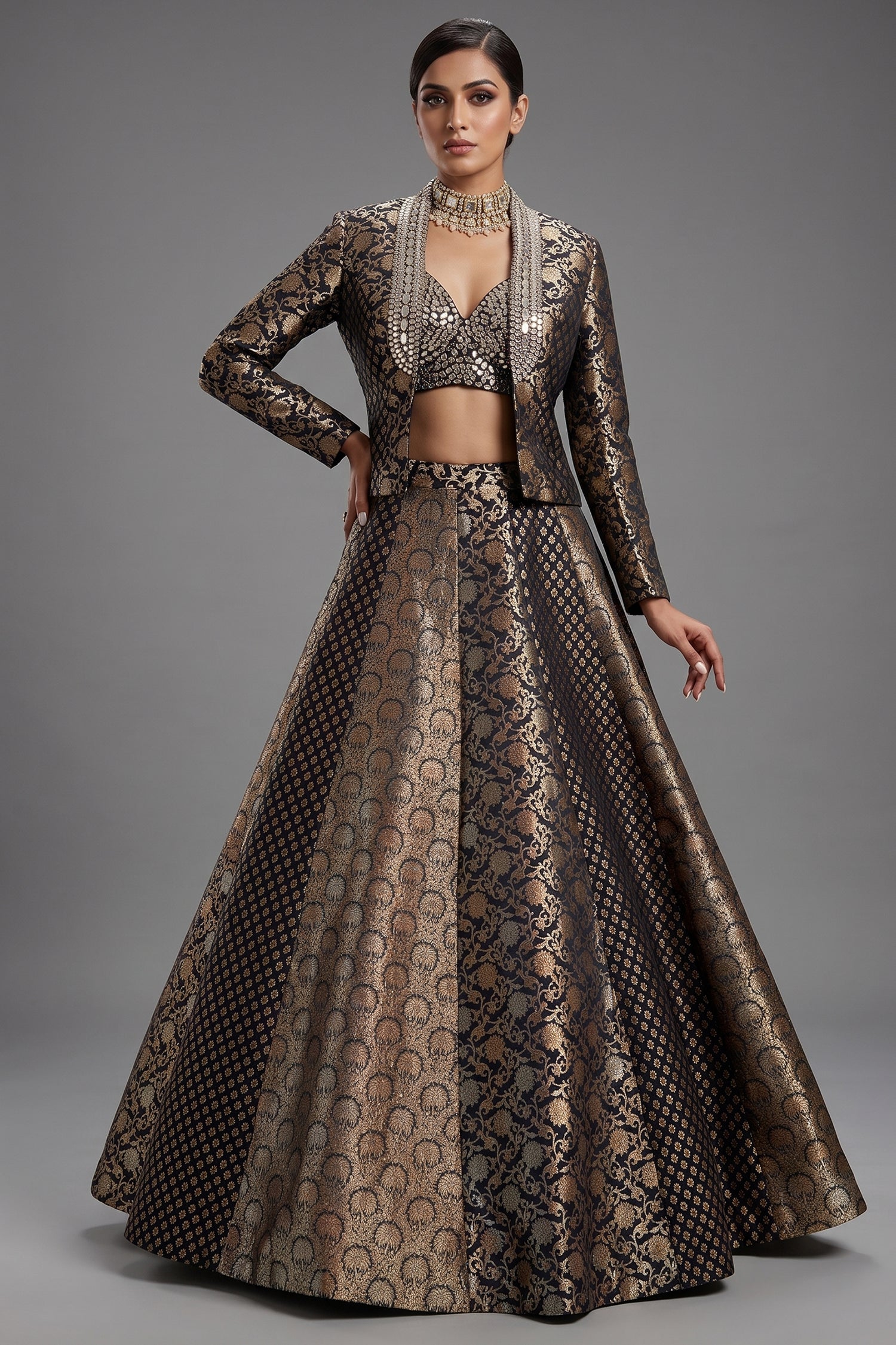 This Black and Golden Banarasi Brocade Silk Lehenga set is a sophisticated blend of traditional weaving and modern layering. The ensemble features a panelled kalidar skirt in rich Banarasi silk, paired with a matching crop top that is heavily embellished with intricate mirror and sequin work. The highlight of the outfit is the structured Banarasi jacket, adorned with elaborate embroidery along the lapels, offering a majestic silhouette for high-end events. Crafted for maximum impact, the metallic gold floral motifs against the deep black base create a timeless aesthetic that is both bold and graceful. This versatile three-piece set is perfect for winter weddings, evening receptions, or festive celebrations where you want to make a unique style statement.