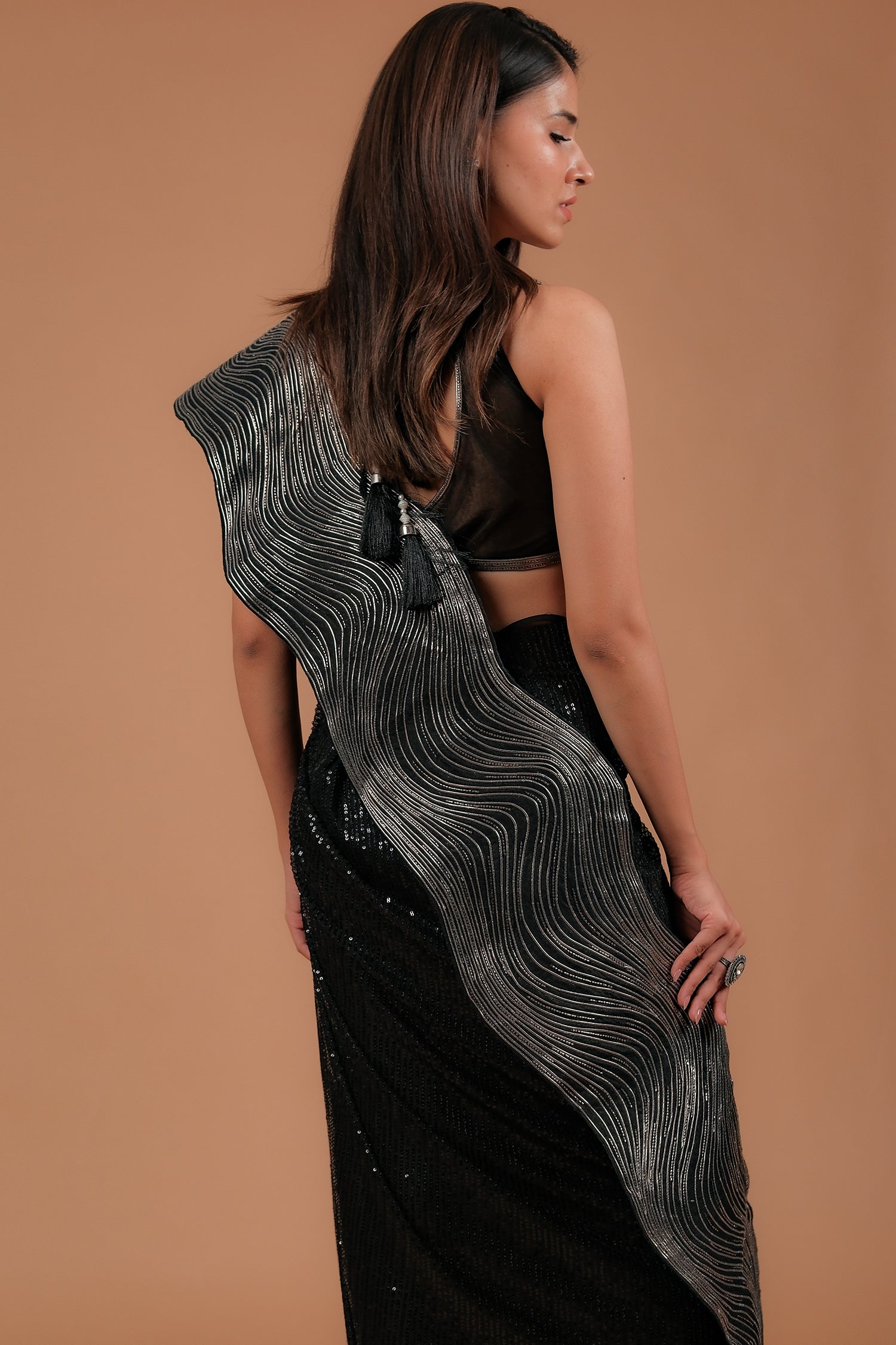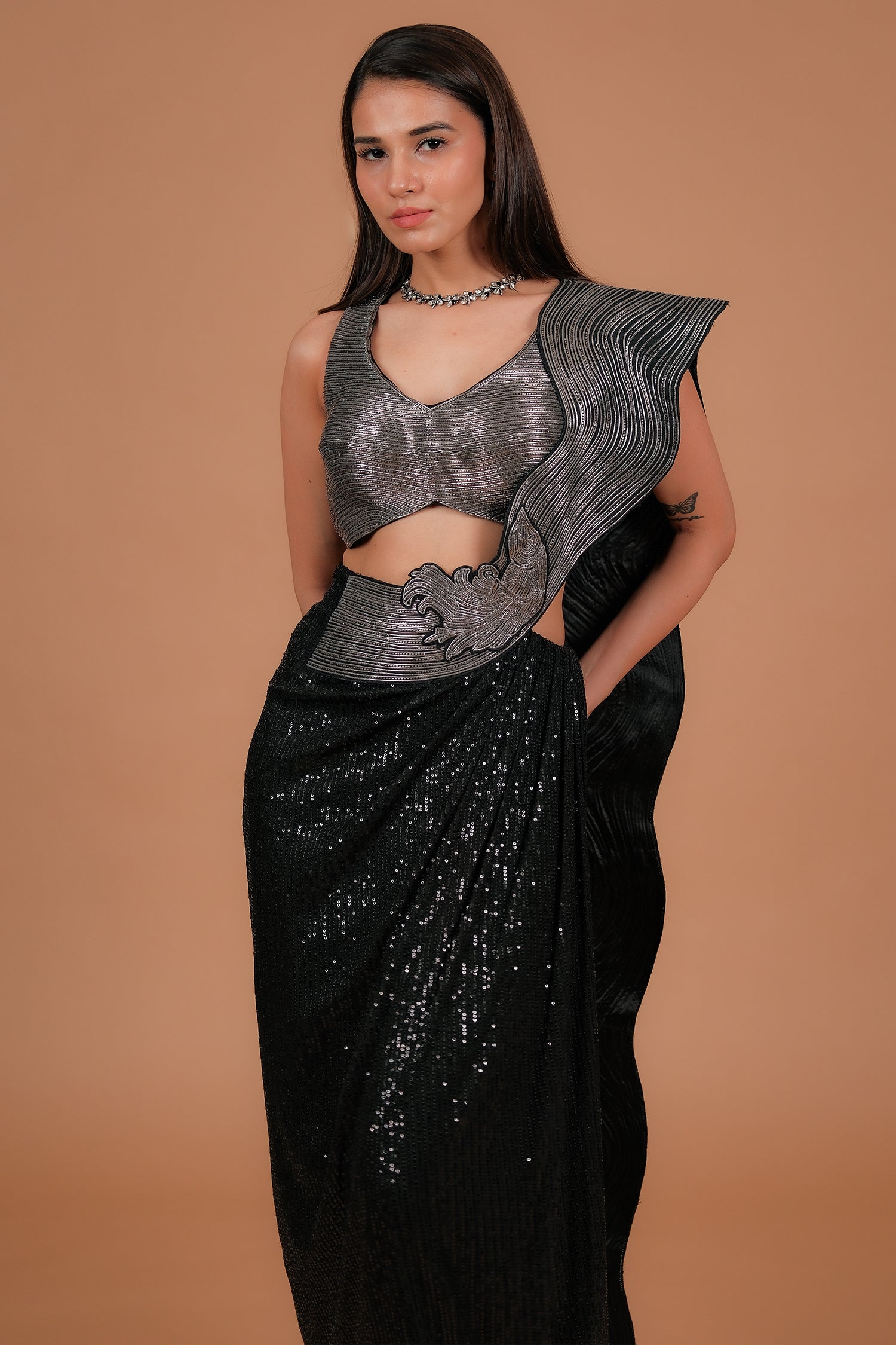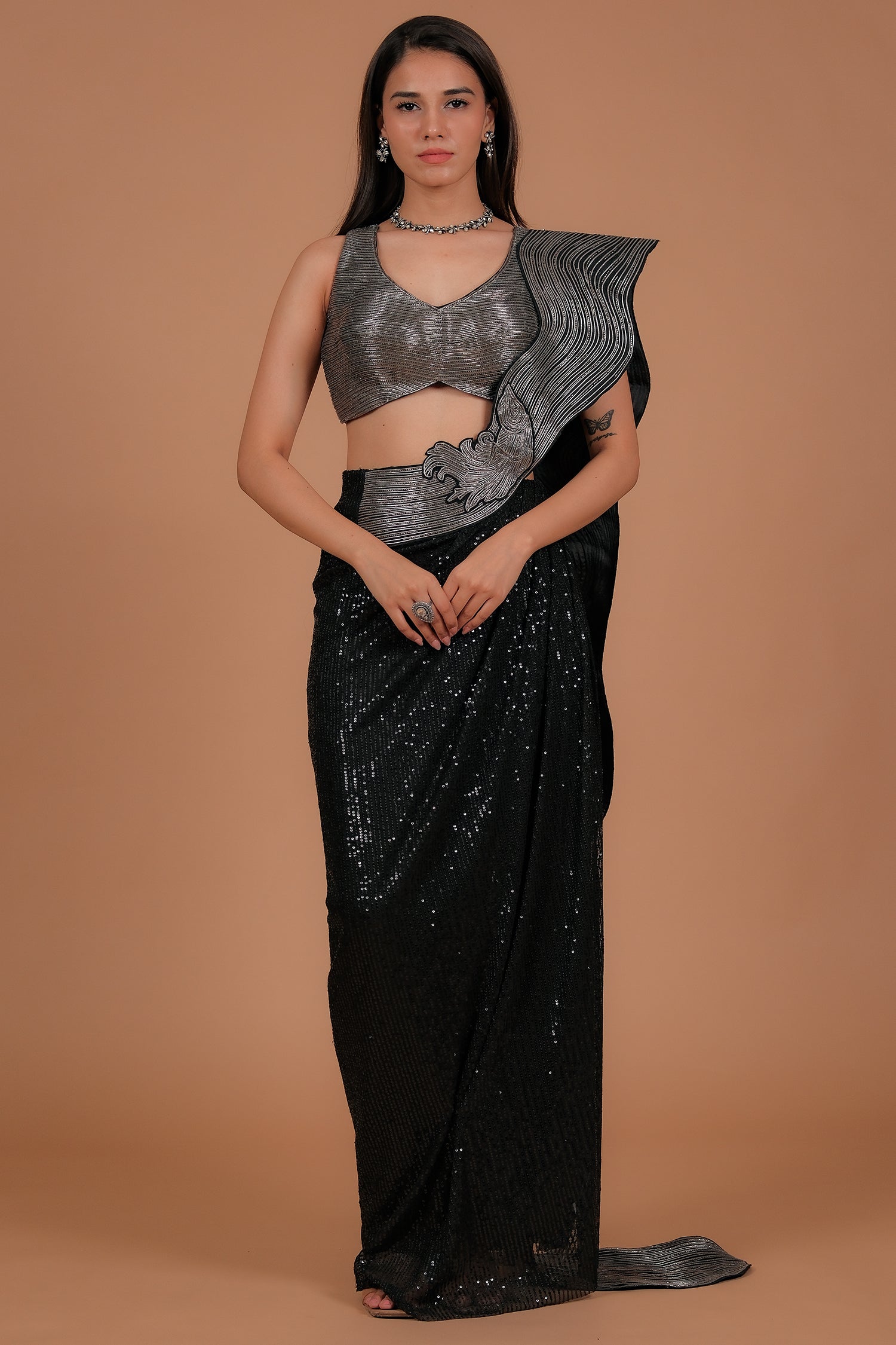 The entire saree features fine sequin detailing that shimmers with every movement—striking the perfect balance between bold glamour and refined sophistication.