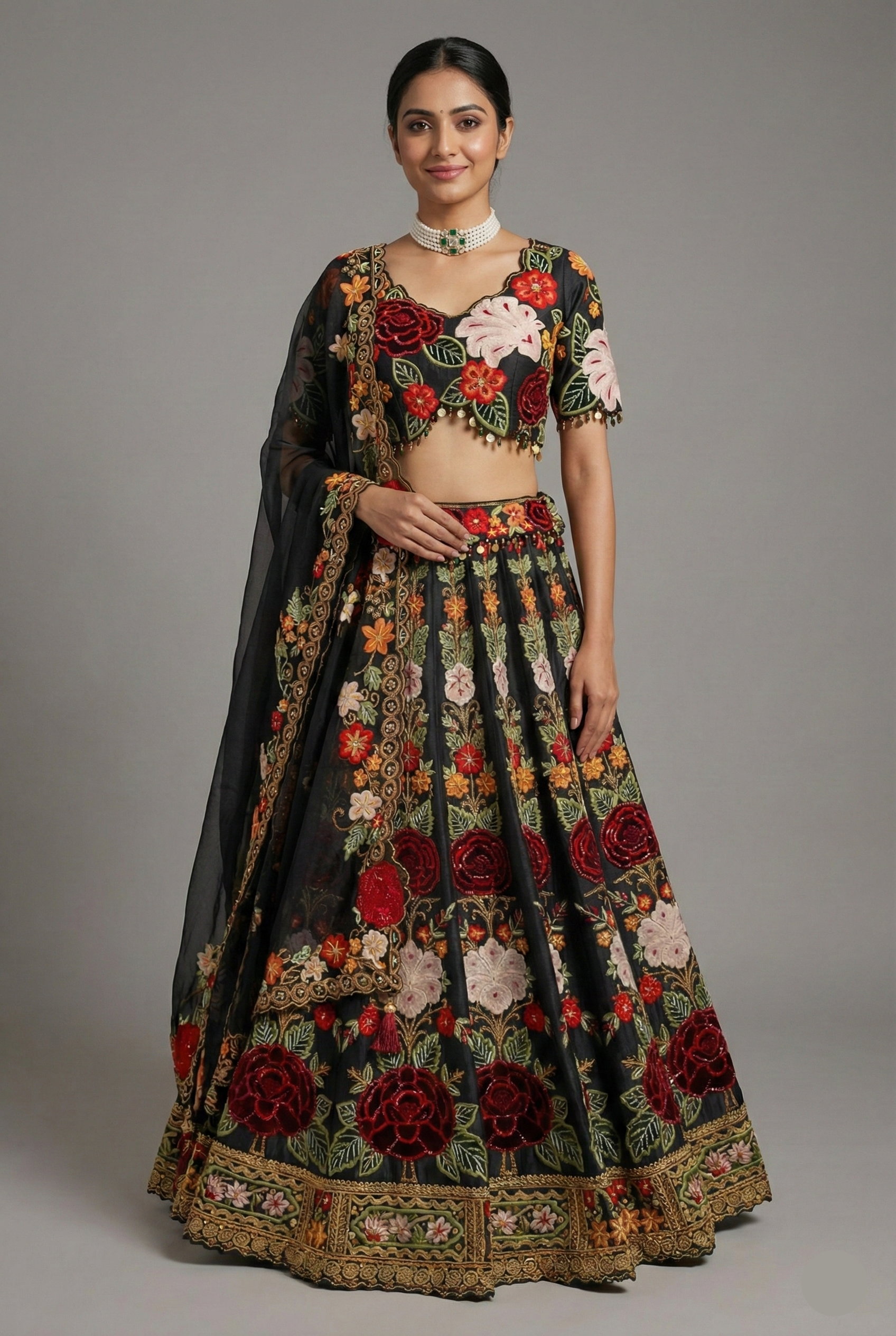 This black raw silk lehenga blooms with vibrant multi-hued floral embroidery, highlighted with delicate sequin beadwork for a rich festive glow. The short-sleeved blouse mirrors the same bold florals, giving the set a beautifully cohesive look. Its flowing dupatta adds a soft contrast with embroidered borders and playful tassels. Perfect for sangeet, receptions or evening celebrations, it blends elegance with modern charm effortlessly.