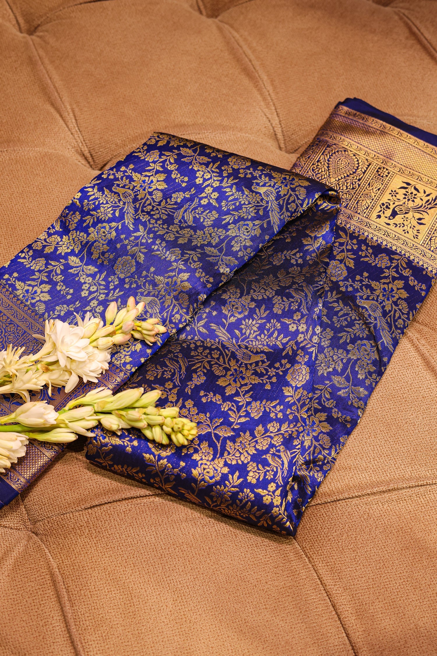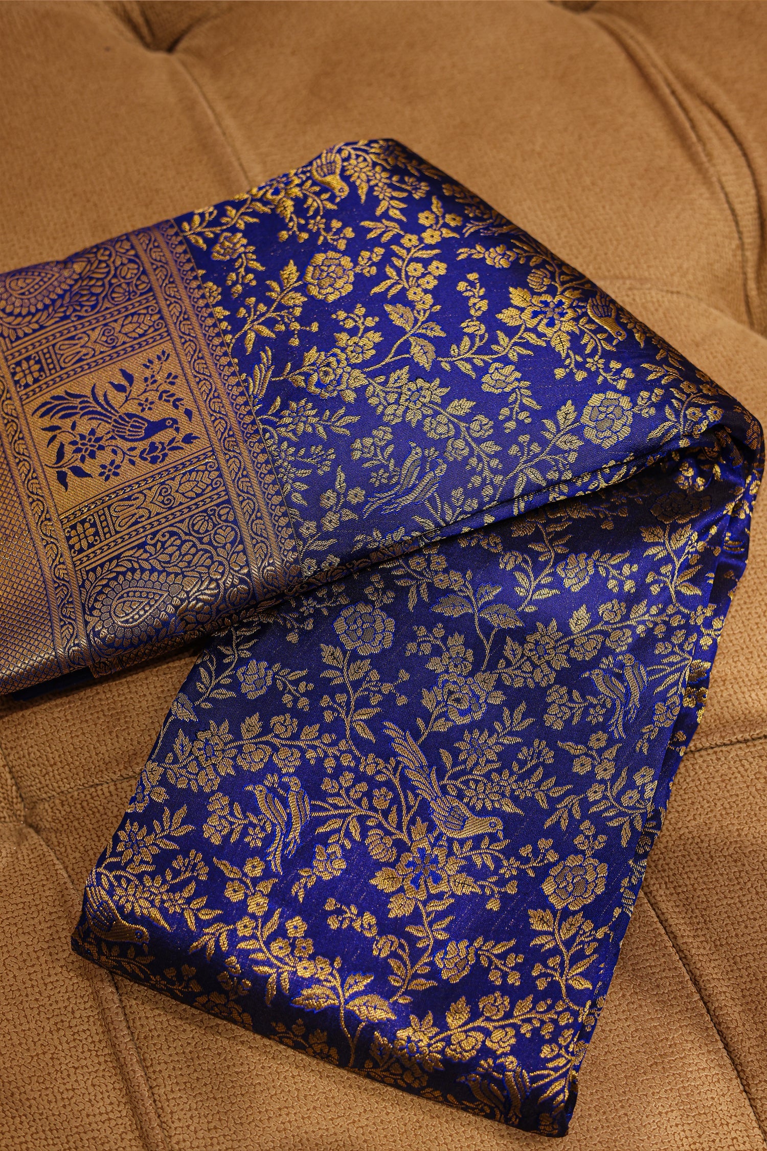 Embrace the richness of tradition with this stunning blue Kanchipuram silk saree, adorned with finely woven classic motifs. The deep blue hue paired with the lustrous silk texture creates a regal charm perfect for weddings, festive rituals, and grand celebrations. Its traditional weaving reflects impeccable craftsmanship, adding depth and elegance to every drape. A timeless masterpiece that beautifully blends heritage and luxury, making it a must have for your ethnic collection.