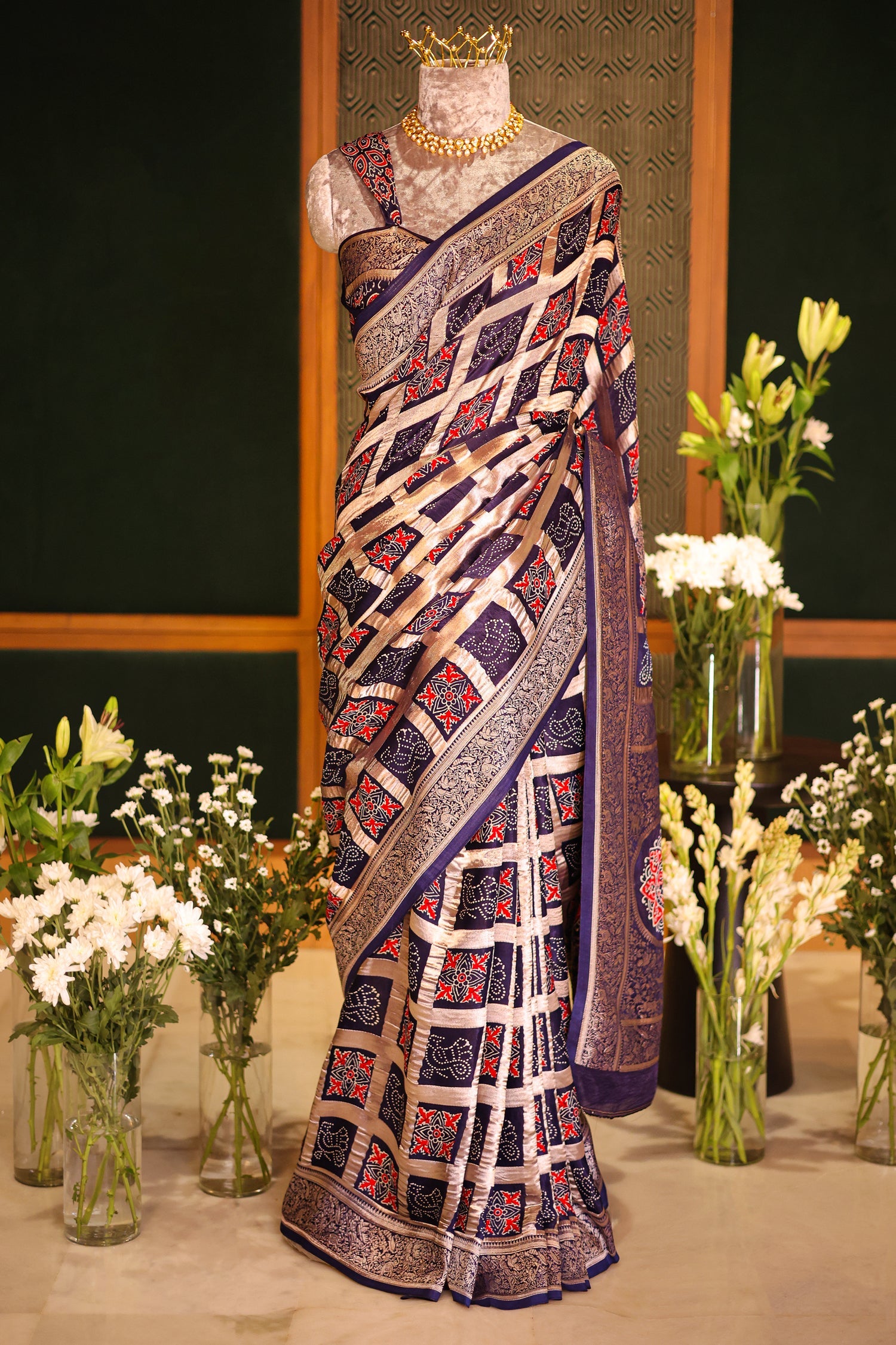 Infused with traditional Ajrakh artistry, this blue modal silk saree stands out with its classic checks and heritage-inspired motifs.The intricately designed border, featuring detailed animal and bird elements, adds a rich cultural charm to the drape. Its fluid modal silk texture brings effortless grace, making it perfect for festive and elegant occasions.Complete with an unstitched blouse piece, this ensemble exudes unmatched luxury and refined elegance.