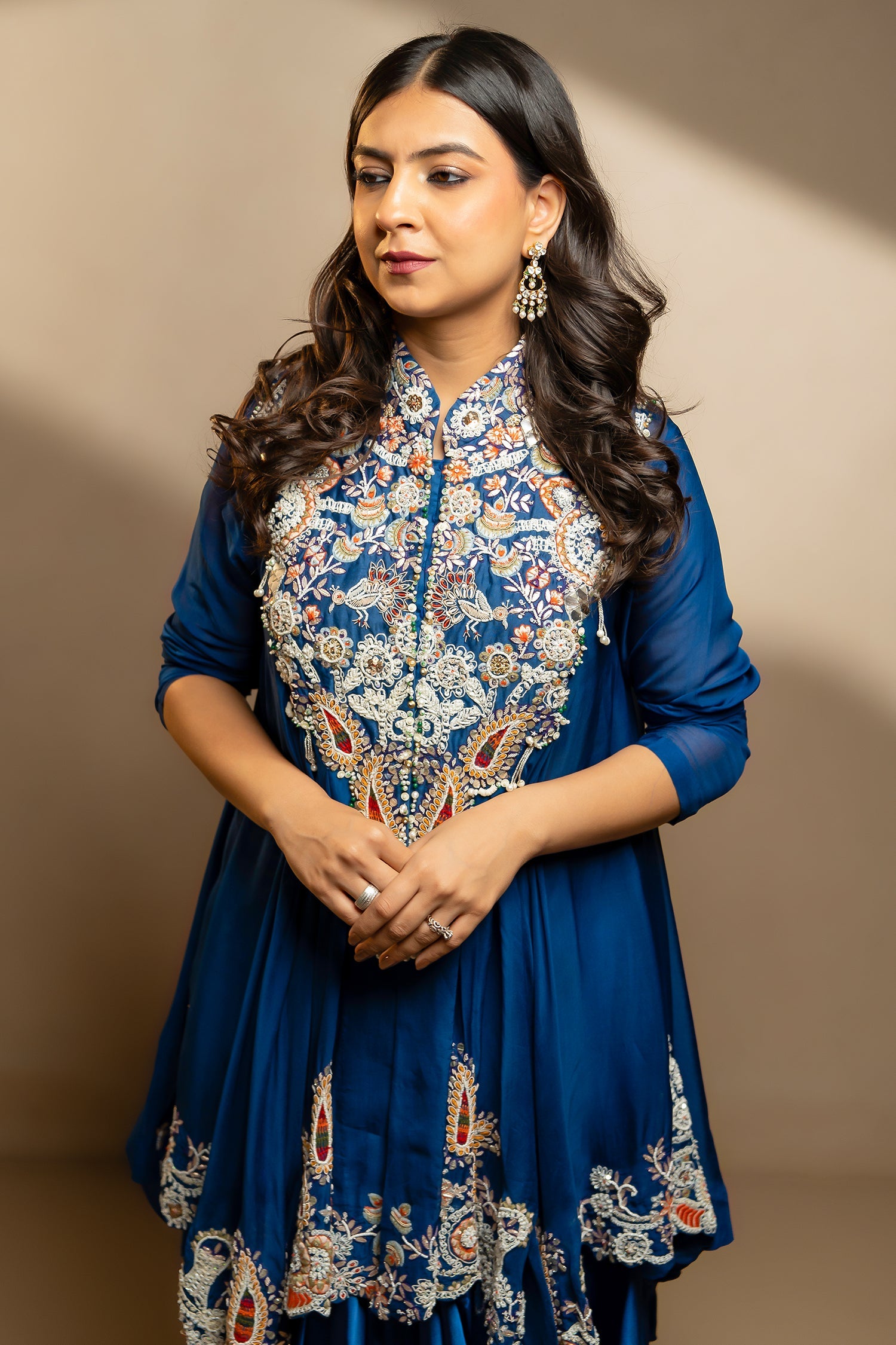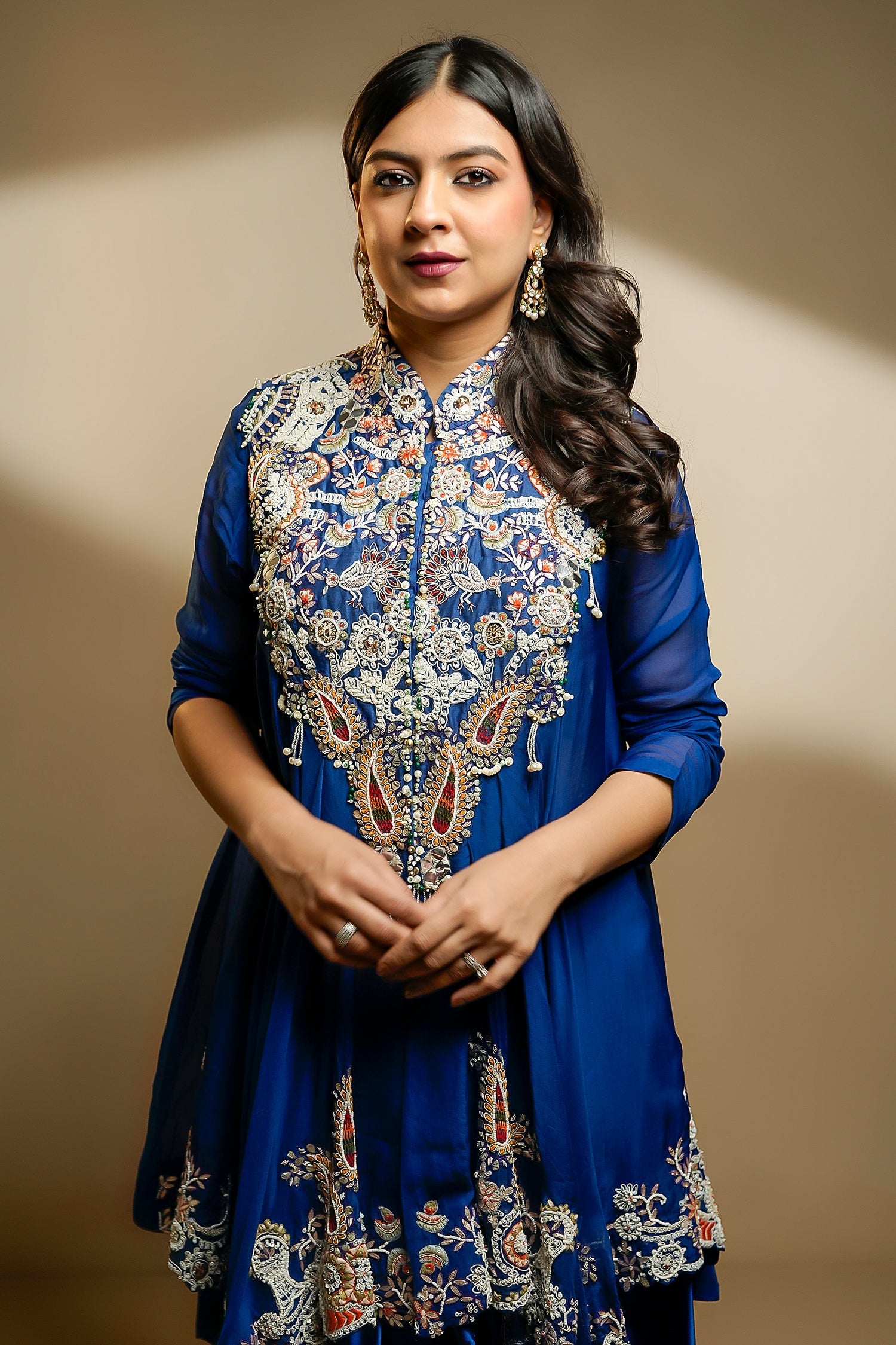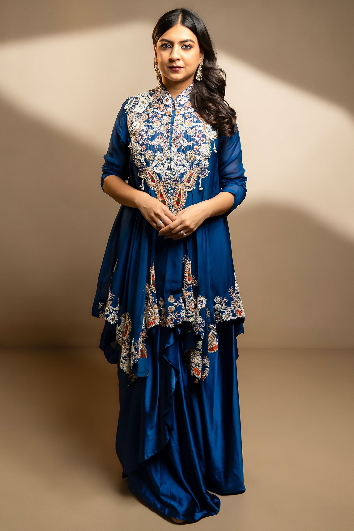 Immerse yourself in refined elegance with this Blue Organza Handworked Bodice Asymmetrical Skirt Set. The handcrafted bodice features intricate embroidery in rich threads, pearls, and sequins, creating a stunning statement of artistry. Paired with a fluid satin asymmetrical skirt, the ensemble drapes beautifully with effortless movement. Designed for modern festive dressing, this set blends tradition with contemporary silhouette finesse.