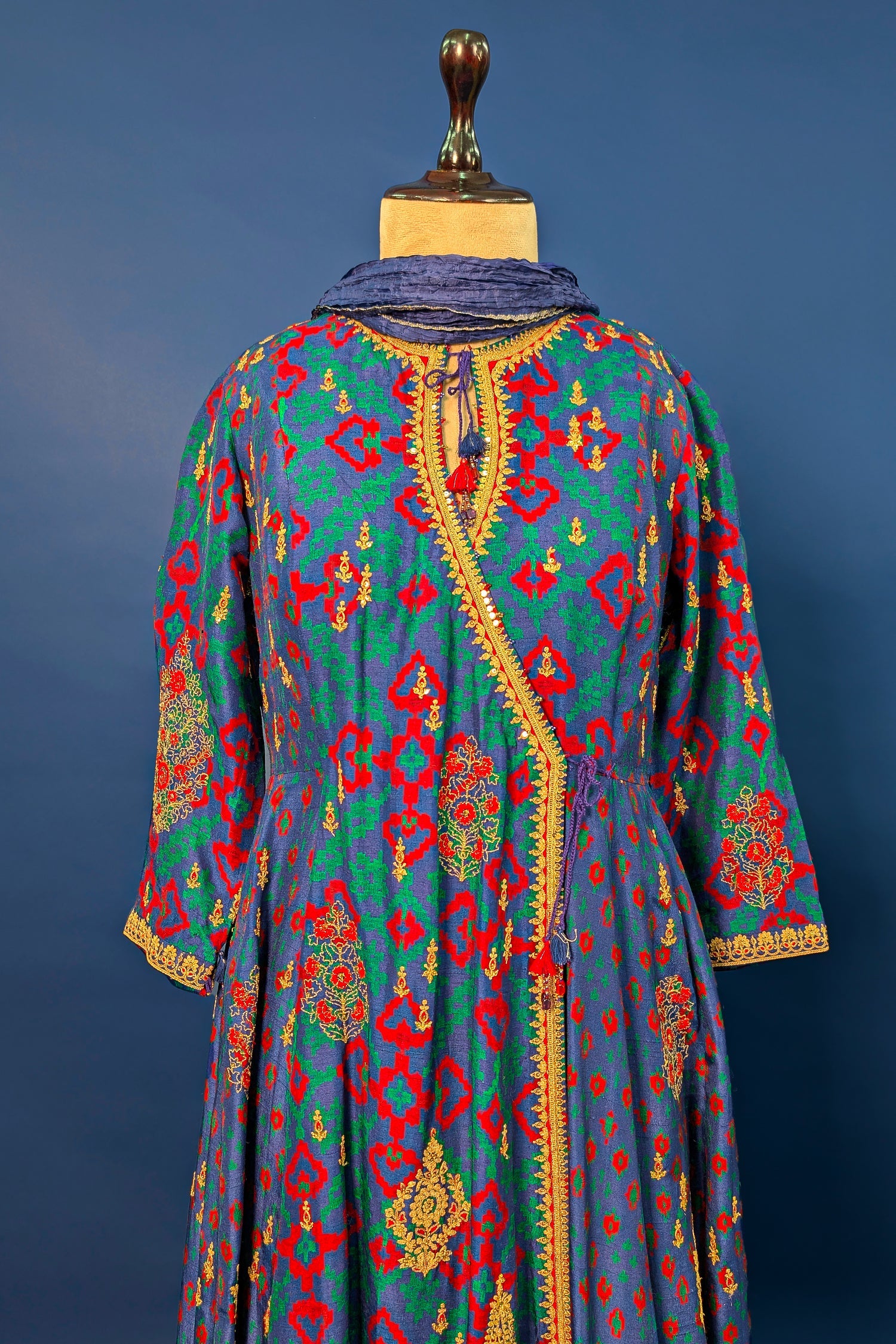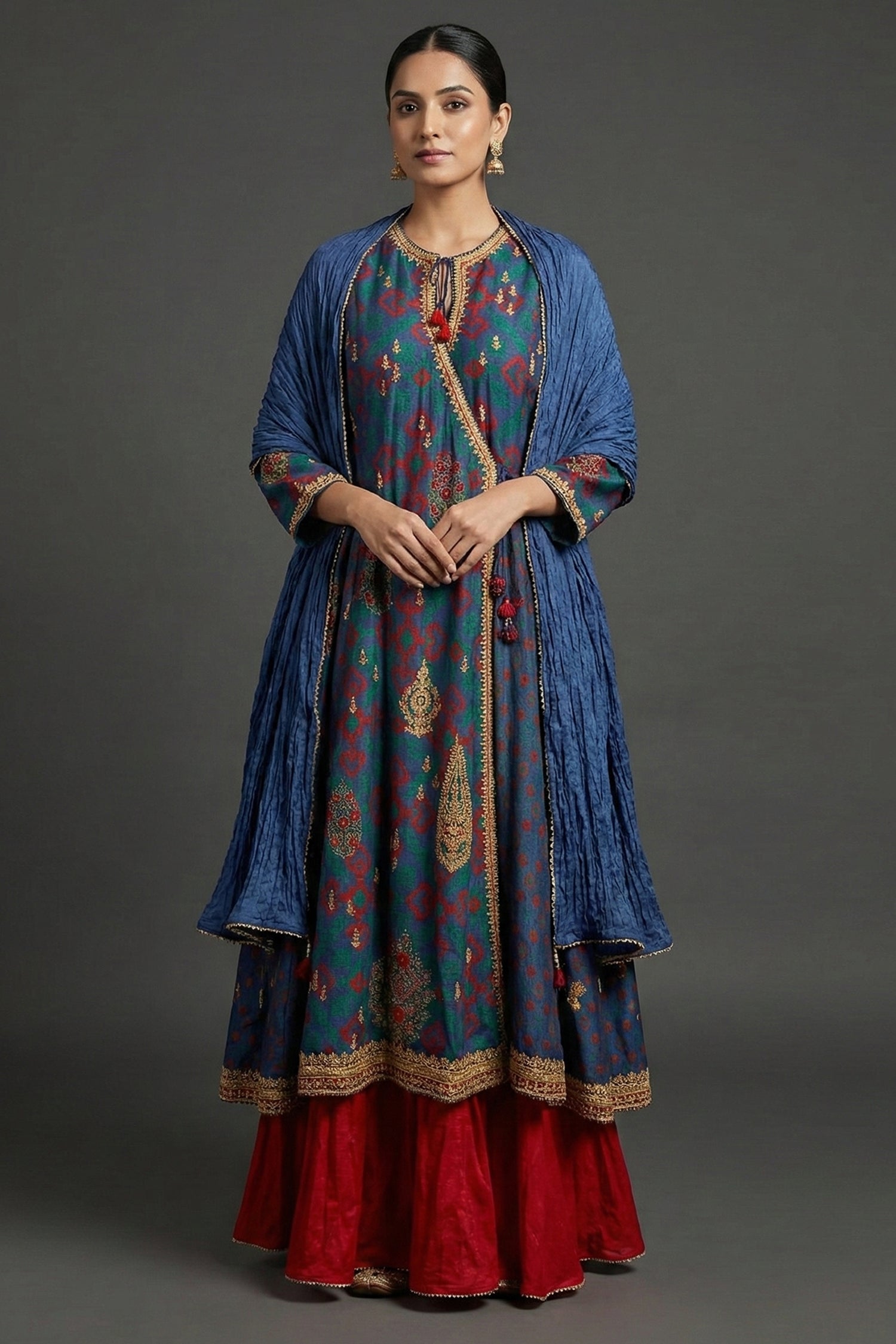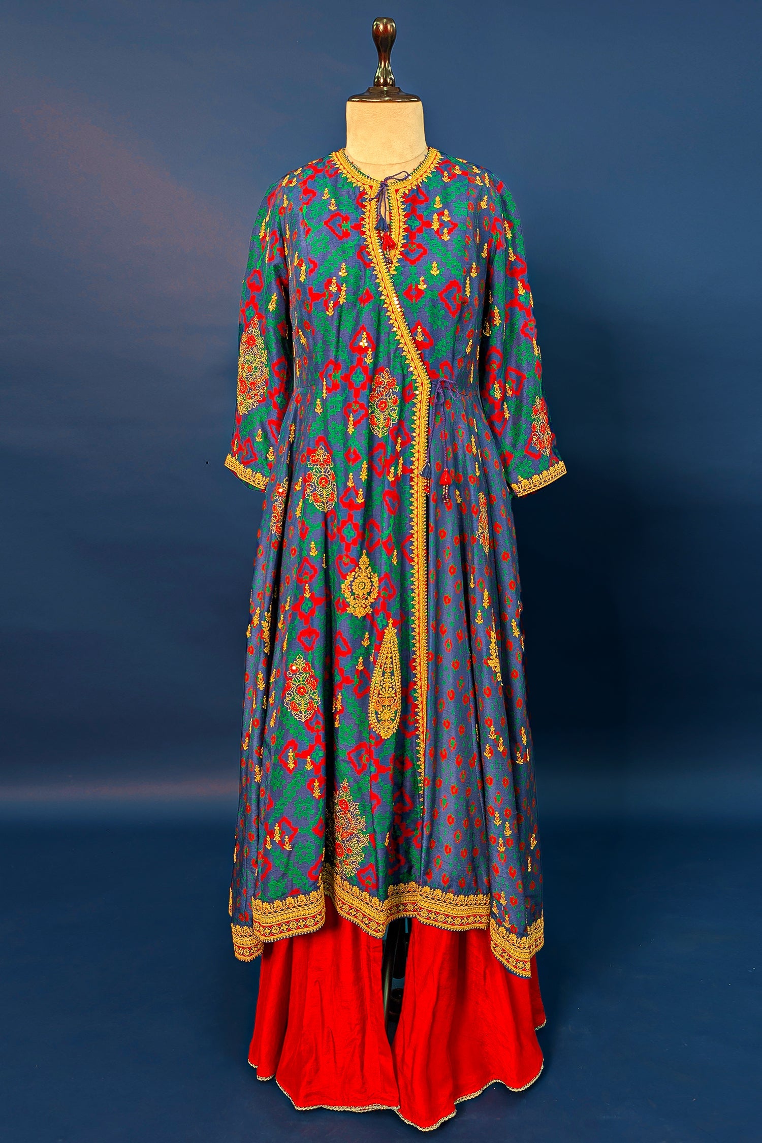 Make a stunning cultural statement in this Blue Silk Palazzo Suit, designed in a sophisticated Angrakha style. The long, overlapping tunic features a rhythmic all-over print with vibrant geometric and floral motifs in red, green, and gold. It is elevated with intricate gold sequin and thread embroidery along the neckline, sleeve cuffs, and side tie-up detailing, which is finished with delicate tassels. The ensemble is paired with contrasting vibrant red wide-leg palazzos that feature a matching gold embroidered border at the hem for a cohesive, festive look.