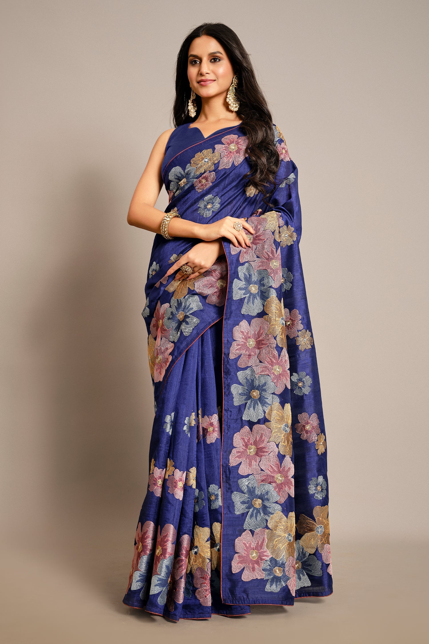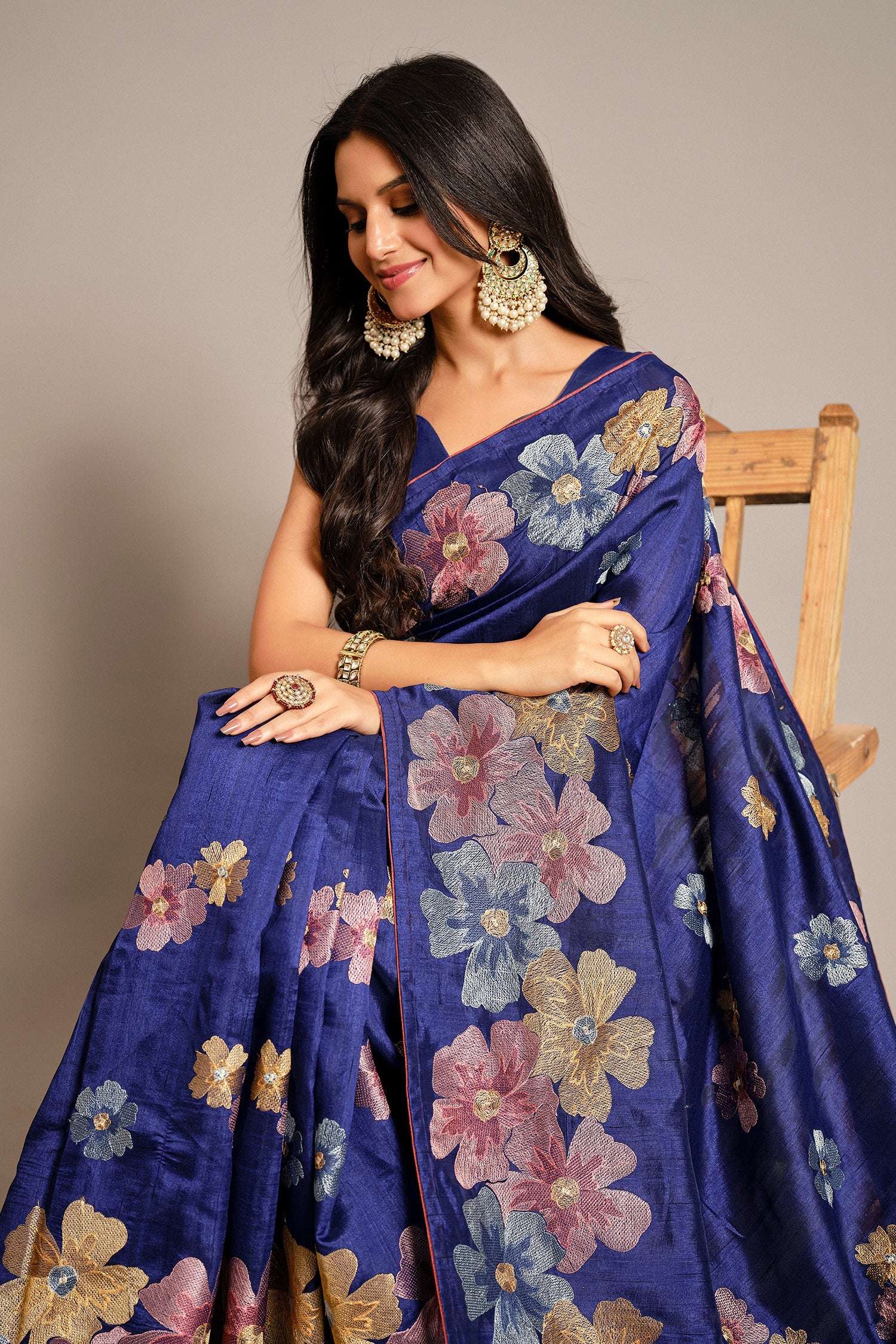 Discover serene sophistication with our Blue Tussar Art Silk Saree, highlighted by delicate floral thread embroidery. A perfect choice for daytime celebrations, cultural events, or formal gatherings.