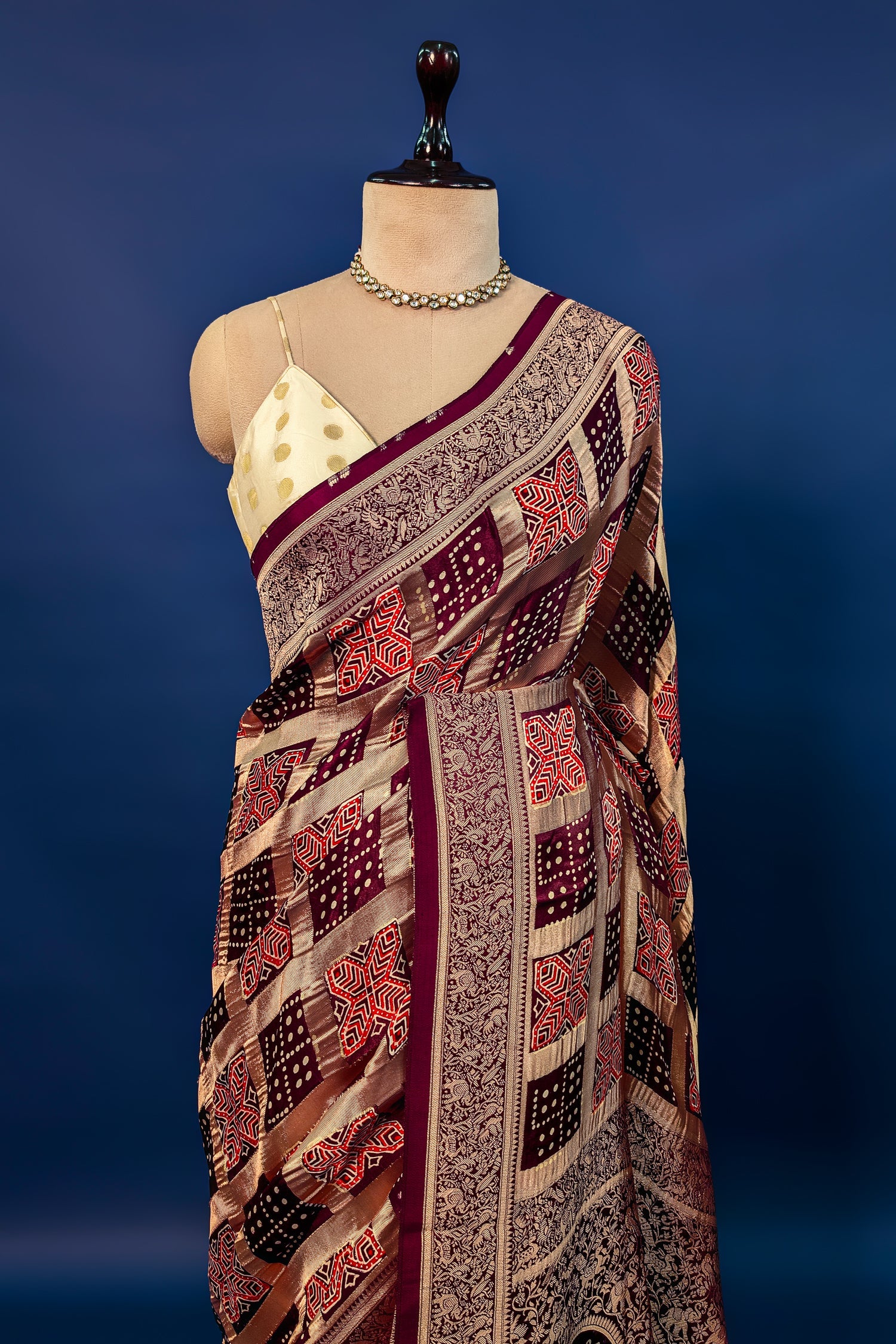 Enhance your ethnic grace with this Brown Modal Silk Saree, featuring classic Ajrakh prints and timeless check patterns. The fabric offers a soft, luxurious drape, making it a perfect blend of traditional heritage and modern comfort. Intricate borders and artisanal motifs add a layer of sophisticated charm to the earthy palette. Complete with an unstitched blouse piece, this ensemble exudes unmatched luxury and refined elegance.