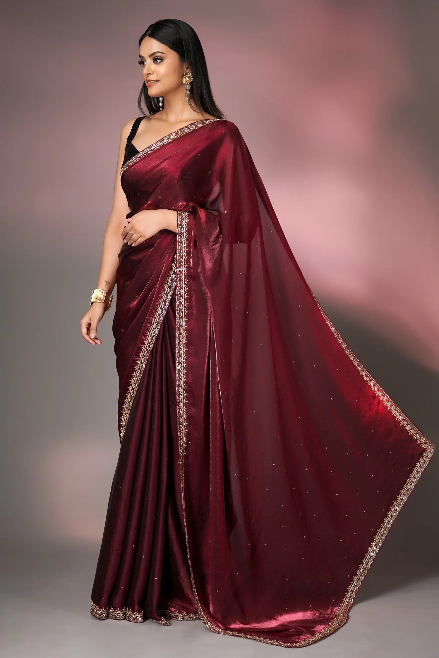 Indulge in regal elegance with our Dark Maroon Glass Tissue Saree, exquisitely handworked for a timeless look. Perfect for weddings, evening festivities, or any celebration where grandeur is key.