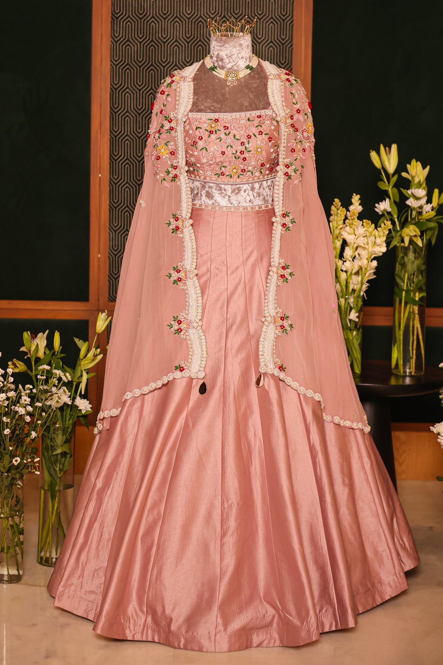 Soft, romantic, and effortlessly sophisticated, this dusty pink lehenga set is crafted in lustrous raw silk that drapes with regal finesse. The beaded crop top showcases intricate floral embroidery, beautifully complemented by a delicately adorned sheer shrug for an ethereal layer of glamour. The structured lehenga enhances movement with subtle shine, making the ensemble perfect for engagements, receptions, or elegant festive soirées. A refined blend of modern charm and timeless grace.