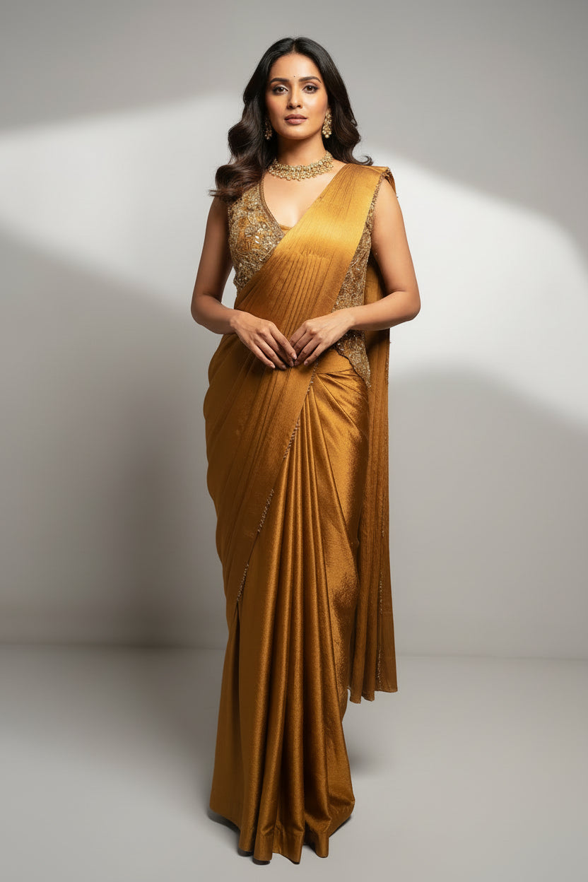 Radiating a regal golden glow, this satin silk pre-draped saree is crafted for the modern woman who appreciates effortless luxury. The fluid satin silk drape falls in rich, sculpted pleats, enhancing its graceful movement and refined silhouette. Its accompanying jacket blouse is a true statement piece, intricately embellished with cutdana, pearls, sequins, and hand-crafted three-dimensional detailing that adds depth, brilliance, and couture charm. The structured jacket design brings a contemporary edge while beautifully complementing the saree’s timeless sophistication.