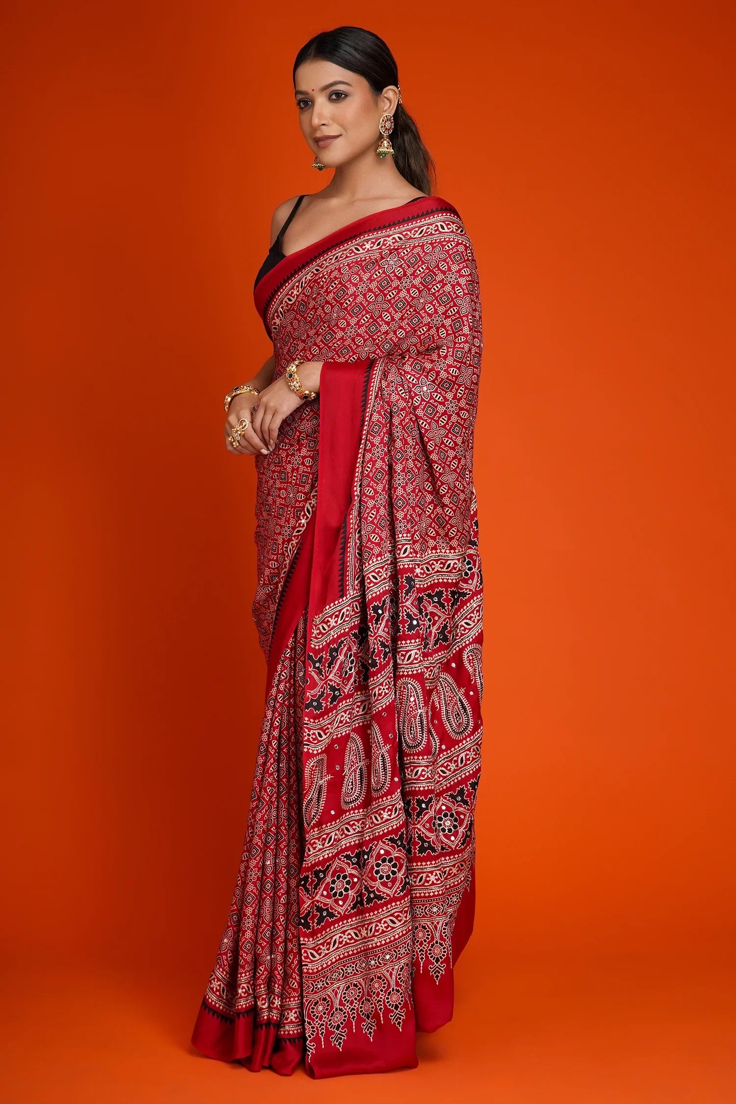 Featuring hand-drawn inspired Ajrakh designs along with bold paisley motifs, the saree pays homage to centuries-old textile artistry—ideal for those who appreciate classic Indian aesthetics.