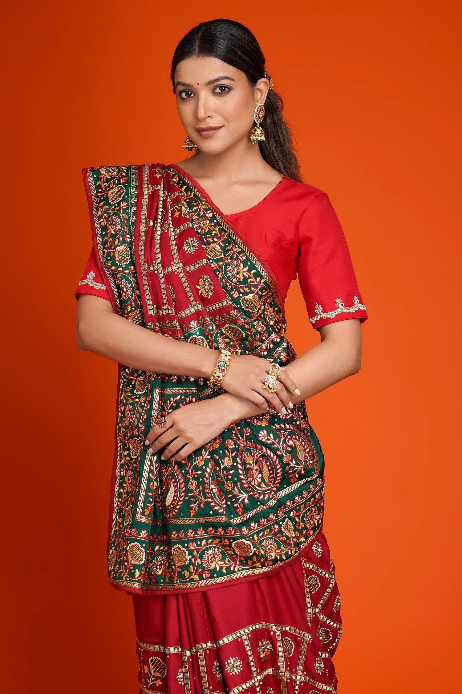 Step into timeless elegance with our Maroon Gharchola Silk Saree, richly woven and embroidered to celebrate heritage in every thread. Perfect for weddings, rituals, and grand festivities where tradition takes center stage.