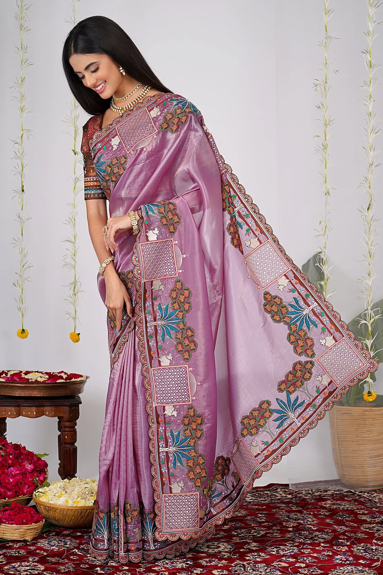 Embrace understated charm with our Mauve Organza Silk Saree, featuring delicate embroidery and a scalloped sequin border. Ideal for daytime weddings, festive celebrations, or elegant gatherings where subtle sophistication shines.