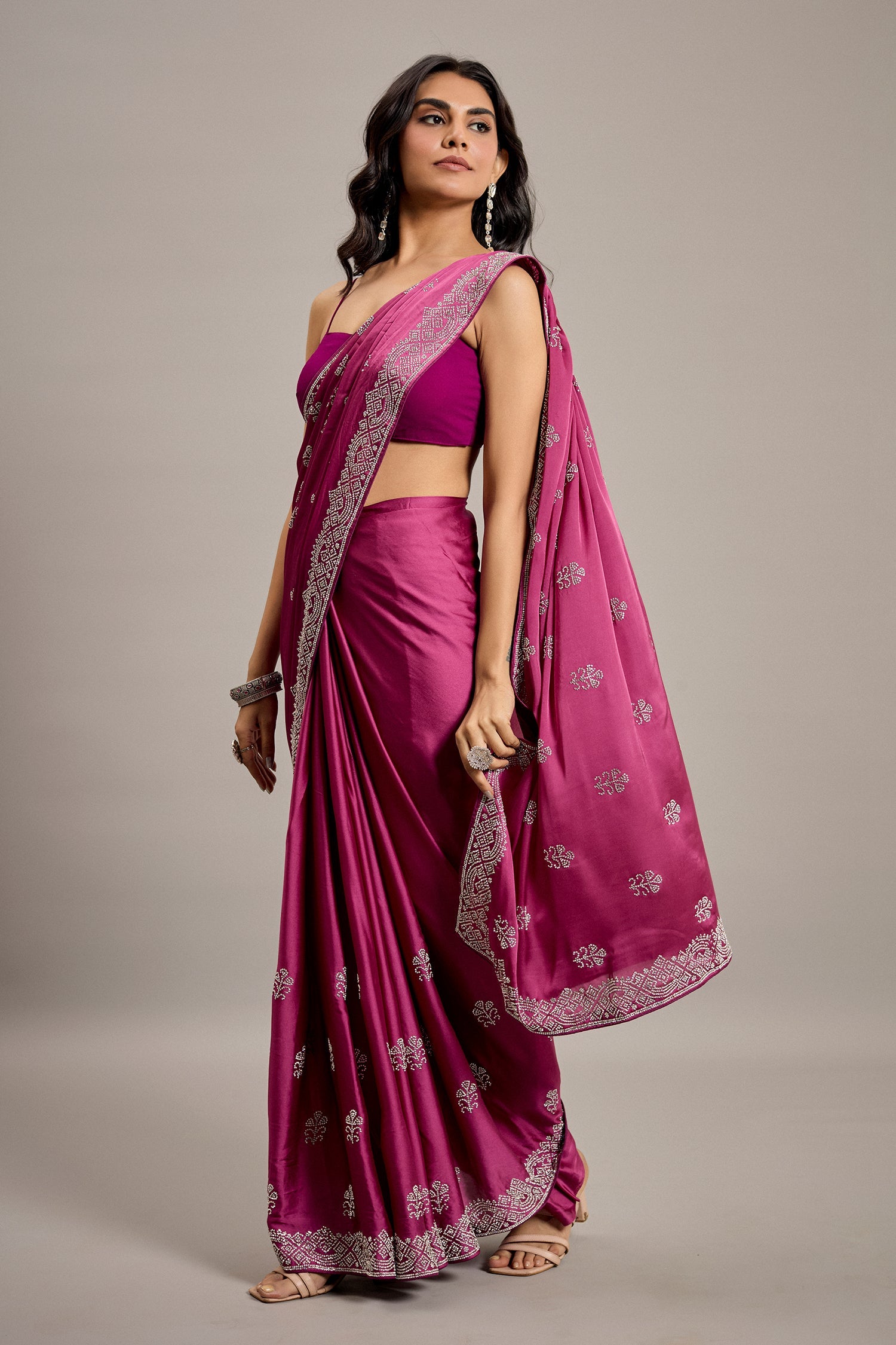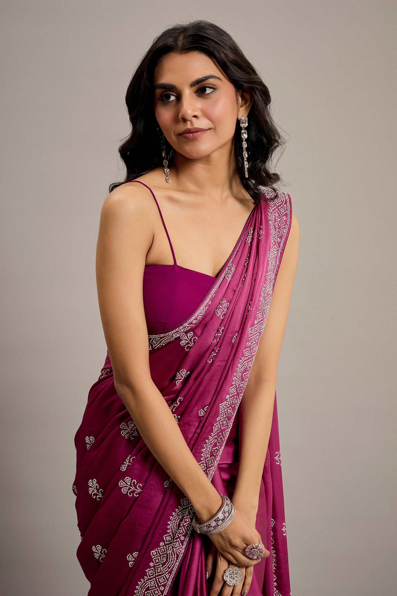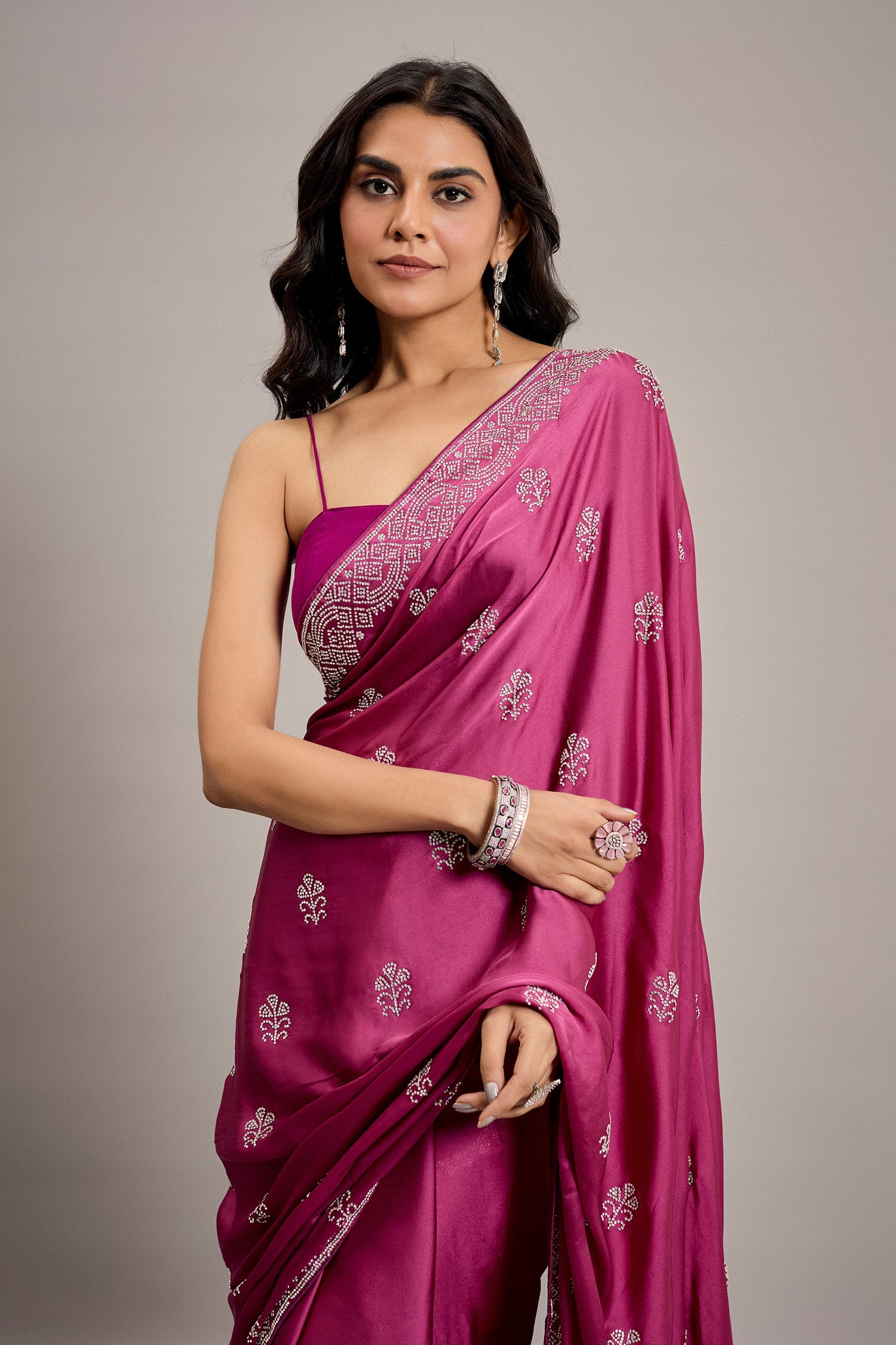 Unveil evening elegance with our Mauve Purple Satin Crepe Silk Saree, enriched with diamond and Swarovski embellishments. A statement piece for receptions, cocktail nights, or grand celebrations.