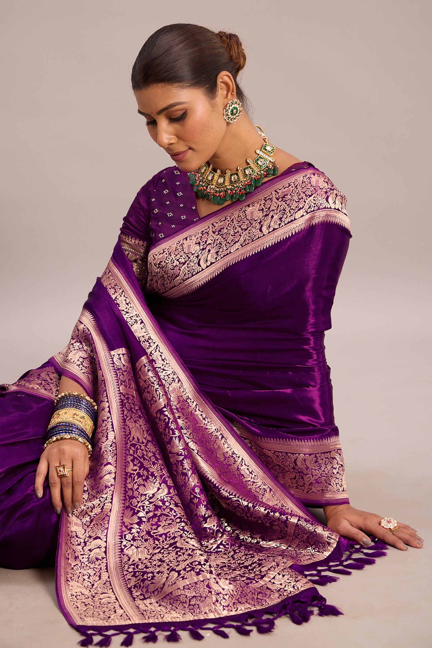 Step into rich tradition with our Mulberry Purple Satin Gaji Silk Saree, featuring exquisite woven borders adorned with animal and bird motifs. An elegant choice for weddings, festive gatherings, or grand celebrations steeped in heritage.