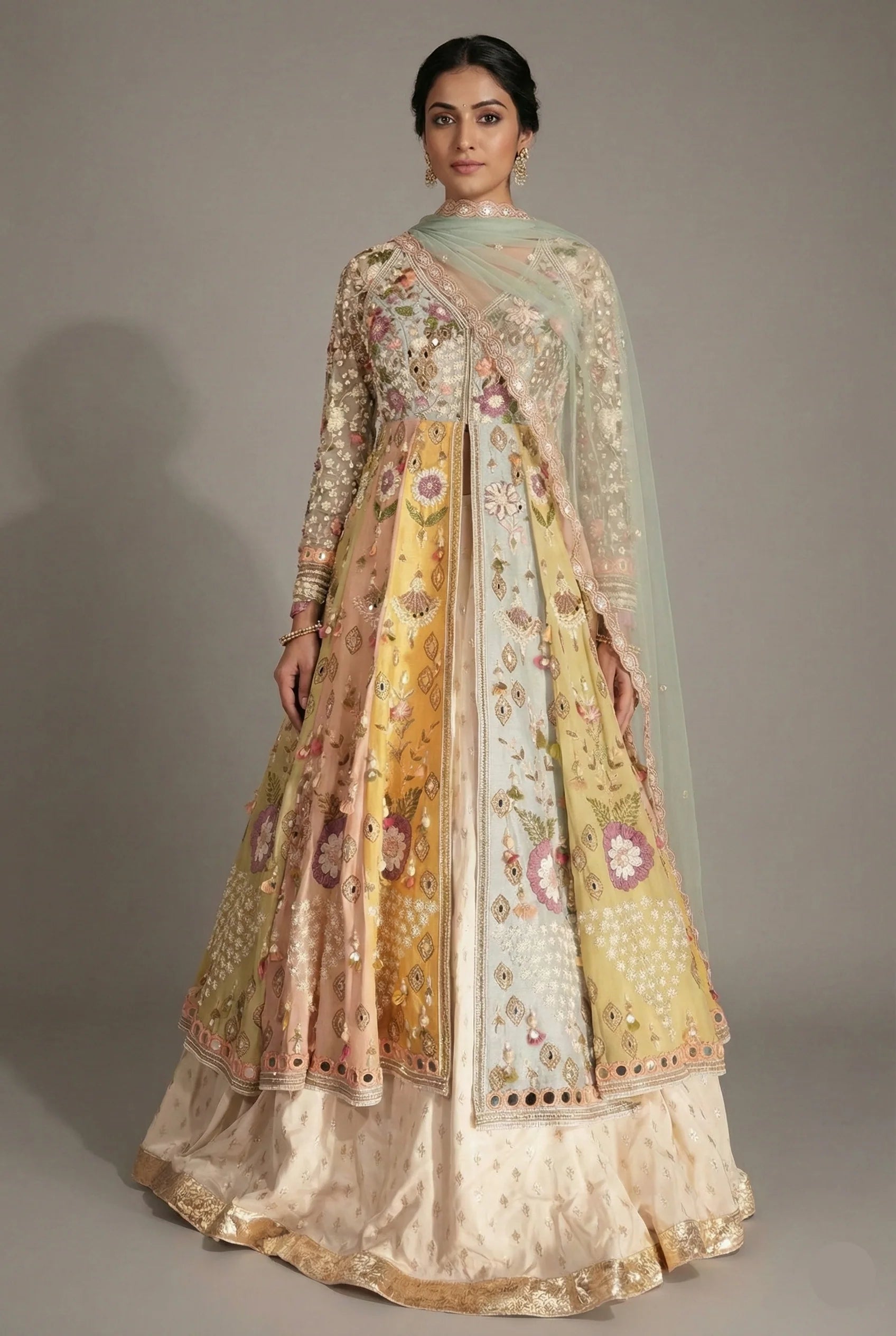 Q: If I’m performing on stage, how does the flare of this Anarkali or Indo-western skirt move? Does it have enough volume to look dramatic in motion? A: Organza is a "flowy and breezy" fabric that adds a charismatic, airy quality to movement. The tiered organza layers of the skirt are specifically designed to create a voluminous, "dreamy" look. This lightweight nature lends an "ethereal grace to every twirl," ensuring the skirt has more than enough volume to look dramatic and fluid during a stage performance.