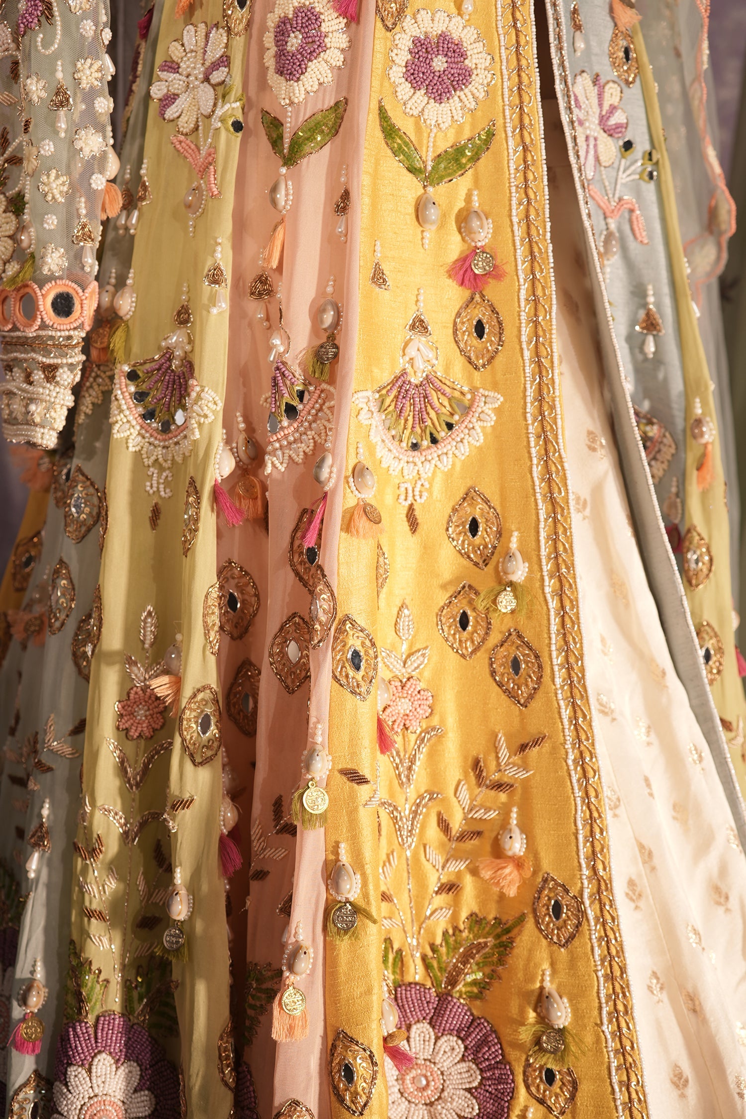Q: If the embroidery is very intricate (like mirror work or heavy stones), is there a risk of it catching on the dupatta or my partner’s outfit while dancing? A: Since the garment features dense handwork, including beads, sequins, and mirrors, there is a minor risk of the embroidery catching on fine fabrics like the net dupatta or a partner's outfit during close dancing. To minimize this, ensure the embroidery threads are properly knotted and avoid storing the piece with items that have exposed zippers.