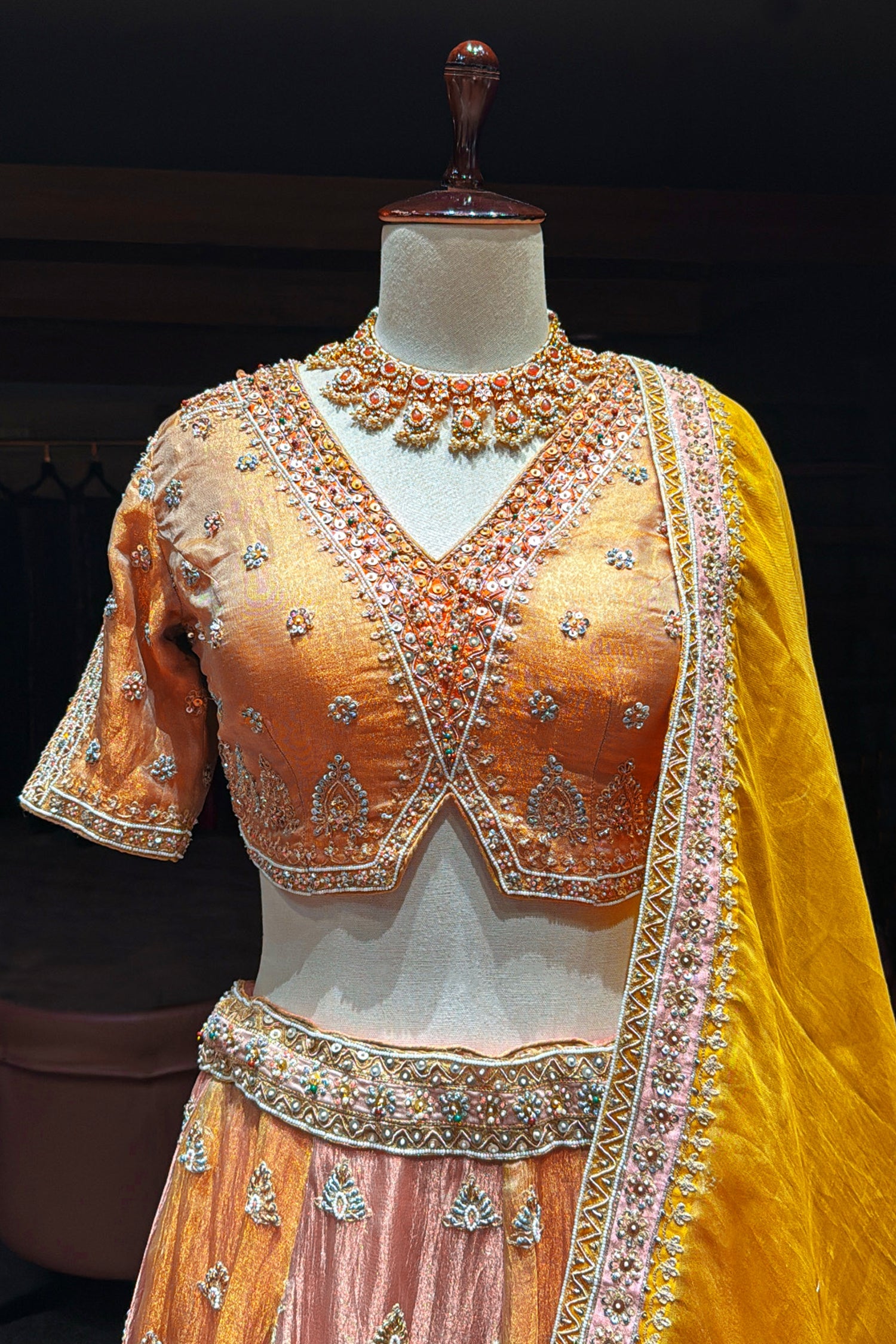 This exquisite multi-colored tissue silk lehenga is crafted with intricate zardosi, beaded detailing, and finely embroidered motifs that elevate its royal charm. Paired with a beautifully embellished blouse and a striking yellow dupatta, it brings together richness, vibrance, and tradition. Designed for weddings and signature celebrations, this ensemble offers a flawless blend of luxury craftsmanship and timeless elegance.
