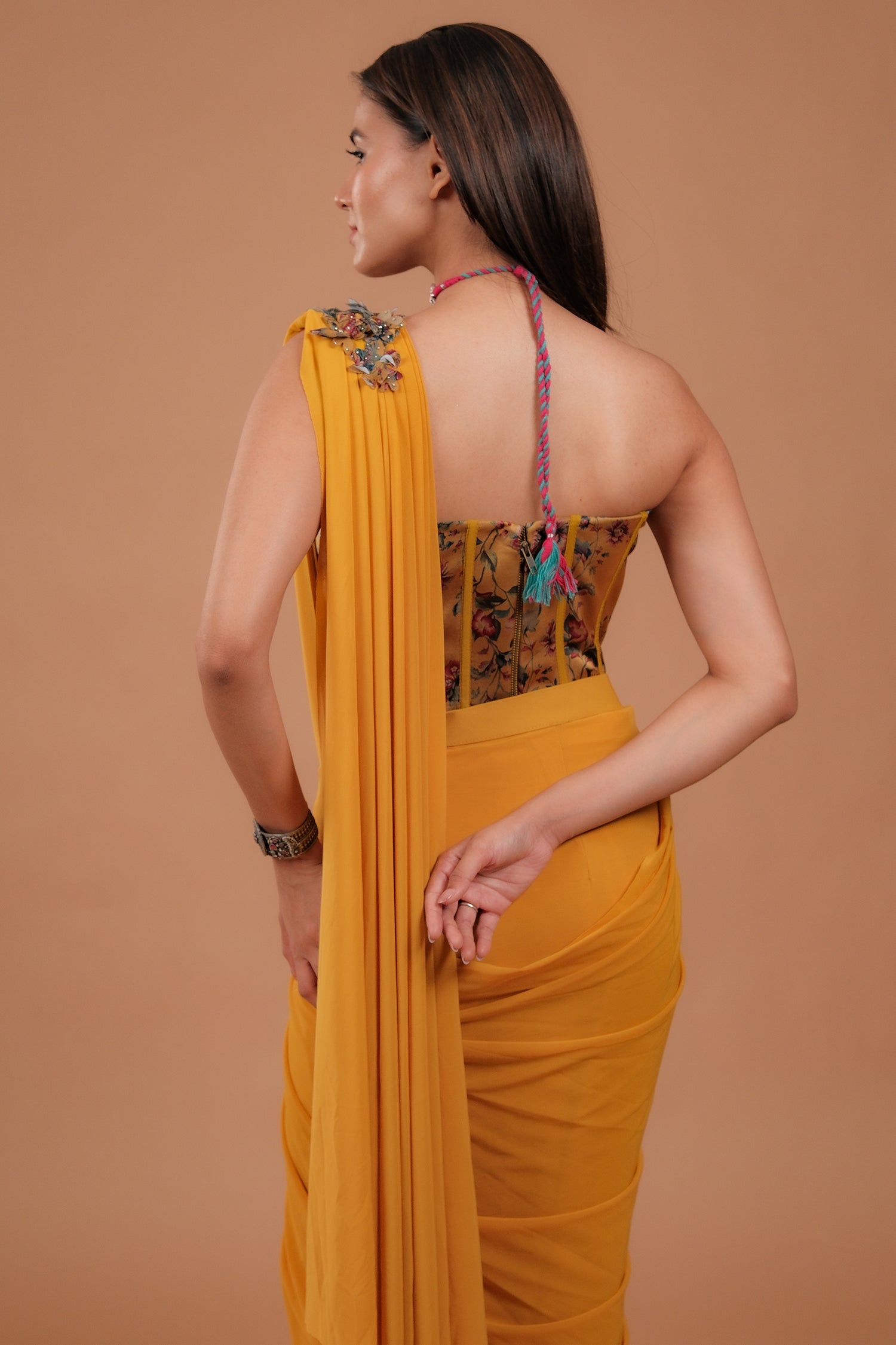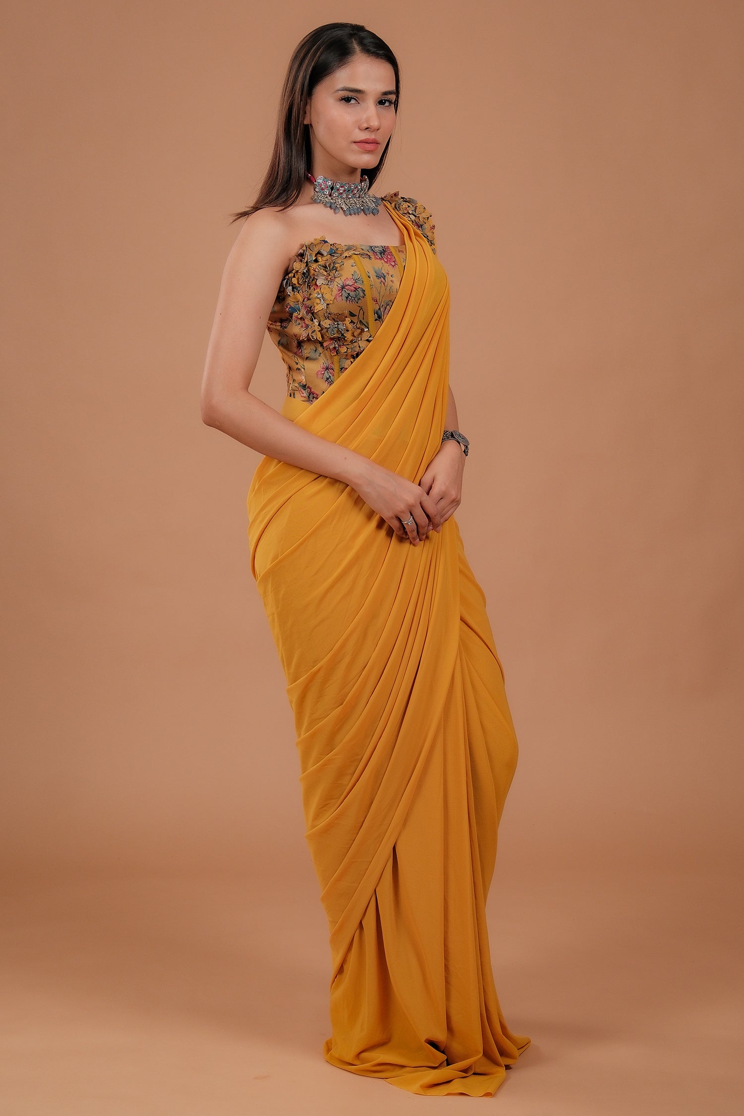 Crafted with a soft stretch lycra lining and sheer net overlay, this saree offers a seamless blend of comfort and style. The warm mustard yellow shade flatters all skin tones and brings cheerful energy to your look.