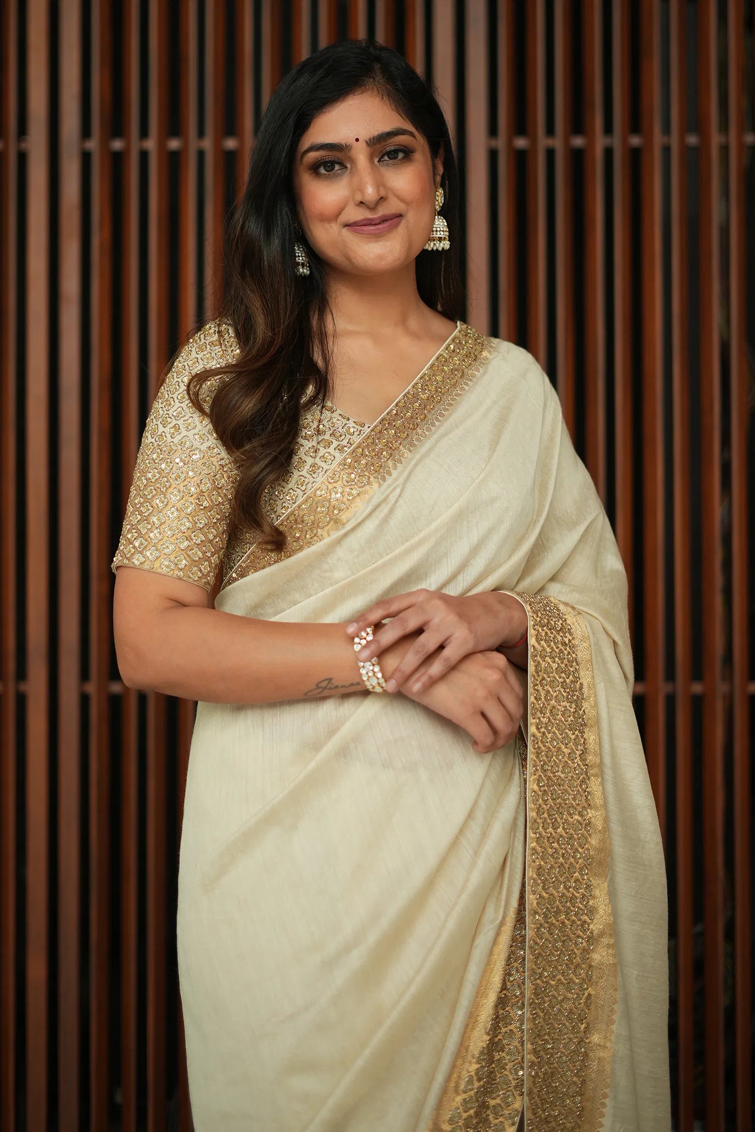 Float through celebrations draped in our Off‑White Tussar Silk Saree—adorned with refined sequin work and delicate woven borders. Perfect for daytime soirees, festive gatherings, or cultural occasions where understated luxury meets artisanal finesse.