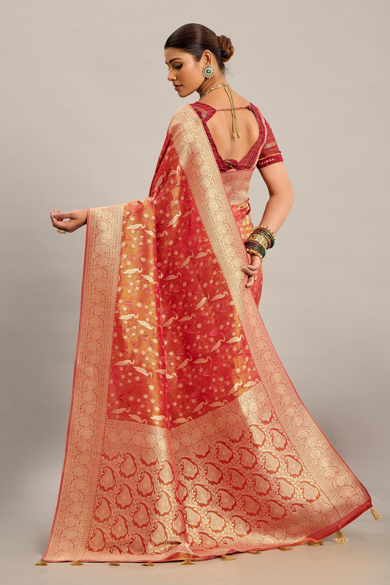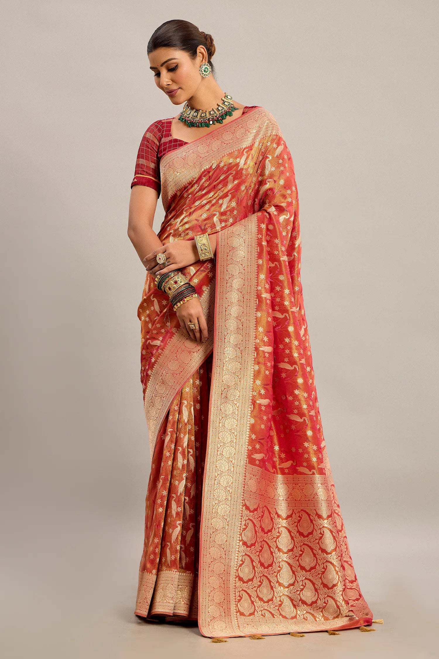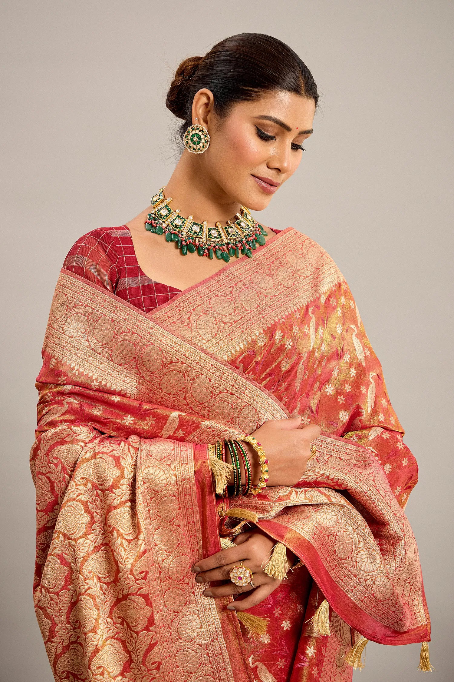 Drape yourself in vibrant tradition with our Orange Tissue Saree, exquisitely woven with bird motifs, a paisley pallu, and subtle pink highlights. Perfect for daytime weddings, festive ceremonies, or cultural celebrations that call for cheerful charm and artisanal elegance.