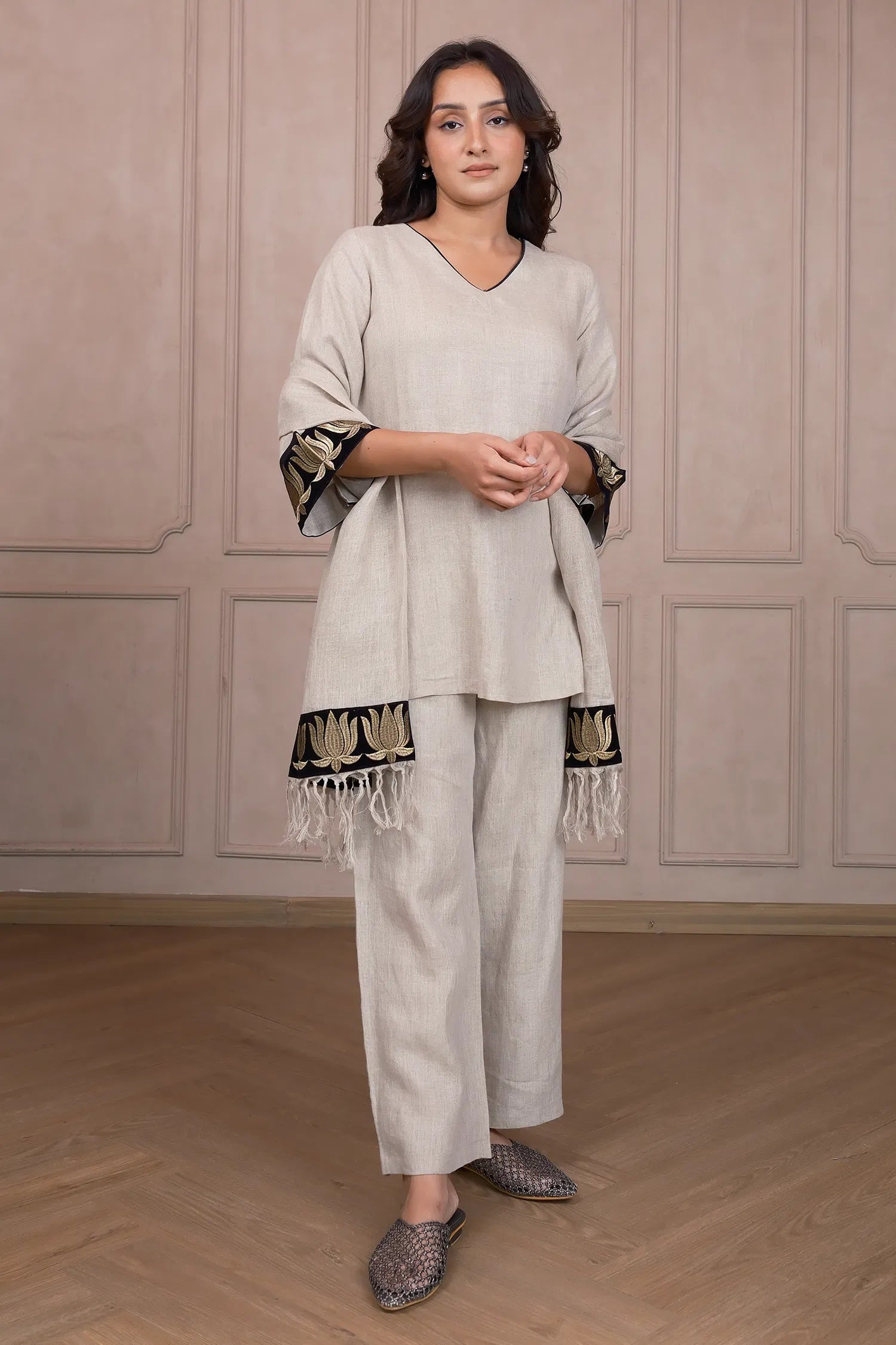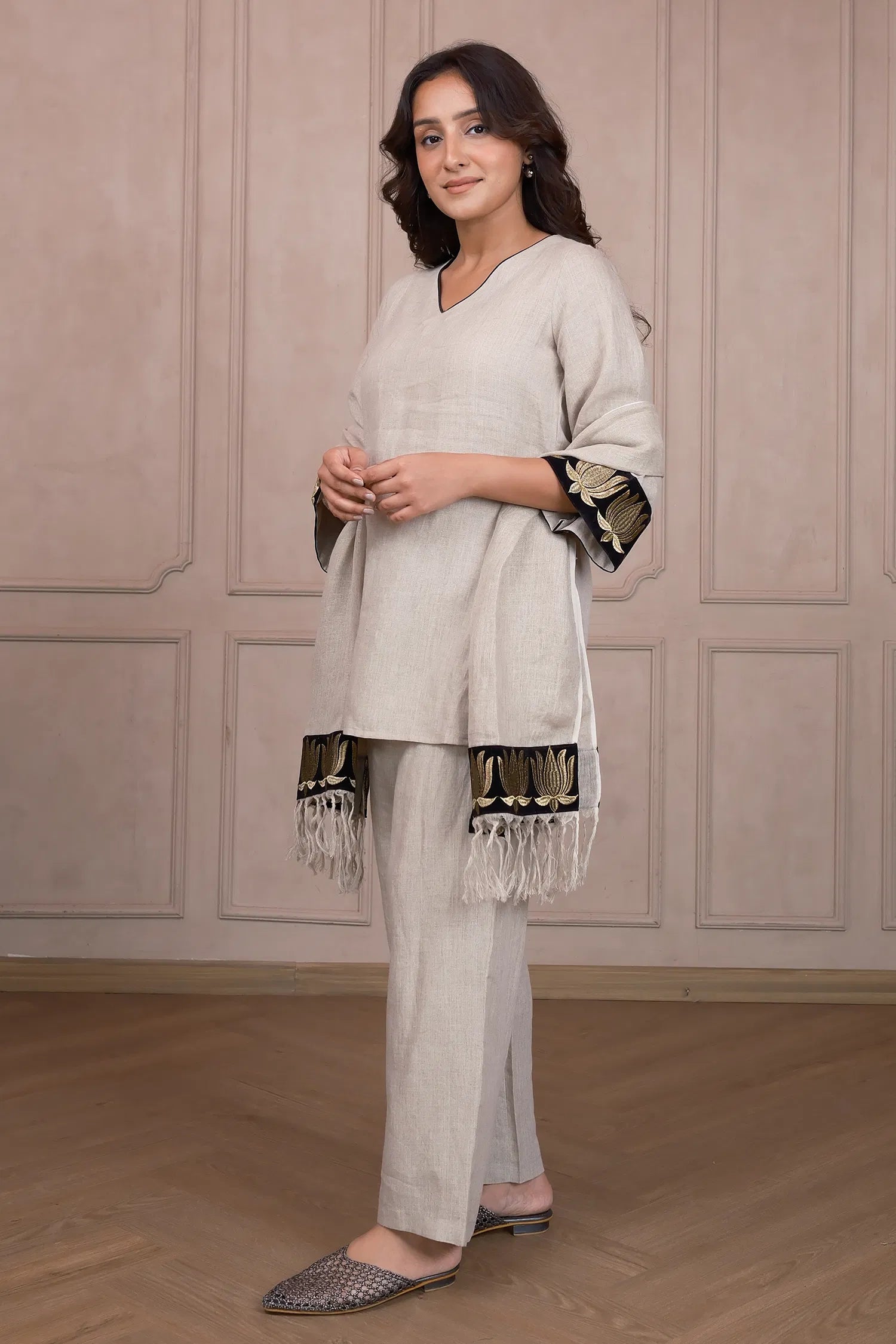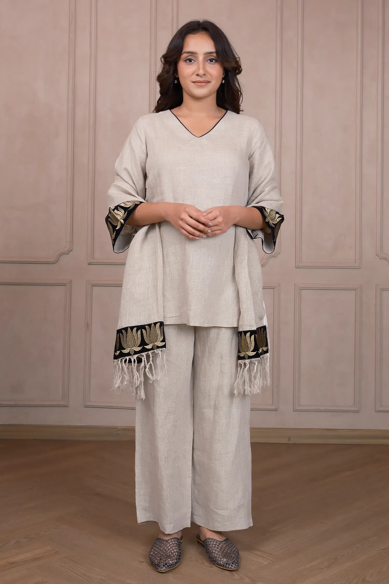 Introduce serene elegance with our Oyster Beige Linen Co‑Ord Set, featuring delicate lotus embroidery that breathes tranquility into every moment. Designed for day-to-evening versatility, this set is perfect for artful gatherings and relaxed sophistication.