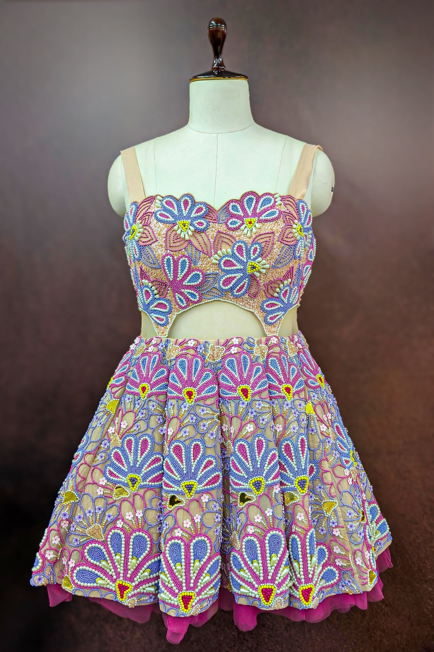 A breathtaking pastel-pink mini dress crafted on delicate net, this piece stands out for its intricate all-over hand beading and artistic cutwork detailing. Every panel is adorned with three-dimensional floral motifs in pink, lilac, blue and lemon tones, giving the dress a rich couture texture that instantly catches the eye. The fitted bodice features a sculpted sweetheart shape with a refined cut-out at the waist, creating a modern, flattering silhouette while maintaining elegant charm. The skirt flares into a soft, voluminous shape, enhanced with layered tulle underneath for graceful movement and a luxurious finish. The back mirrors the same richly beaded artistry,Perfect for high-end parties, pre-wedding soirées, intimate luxury gatherings, or any occasion where you wish to make a bold yet effortlessly glamorous statement — this dress blends playful allure with couture-level craftsmanship, ensuring you stand out with unforgettable elegance.