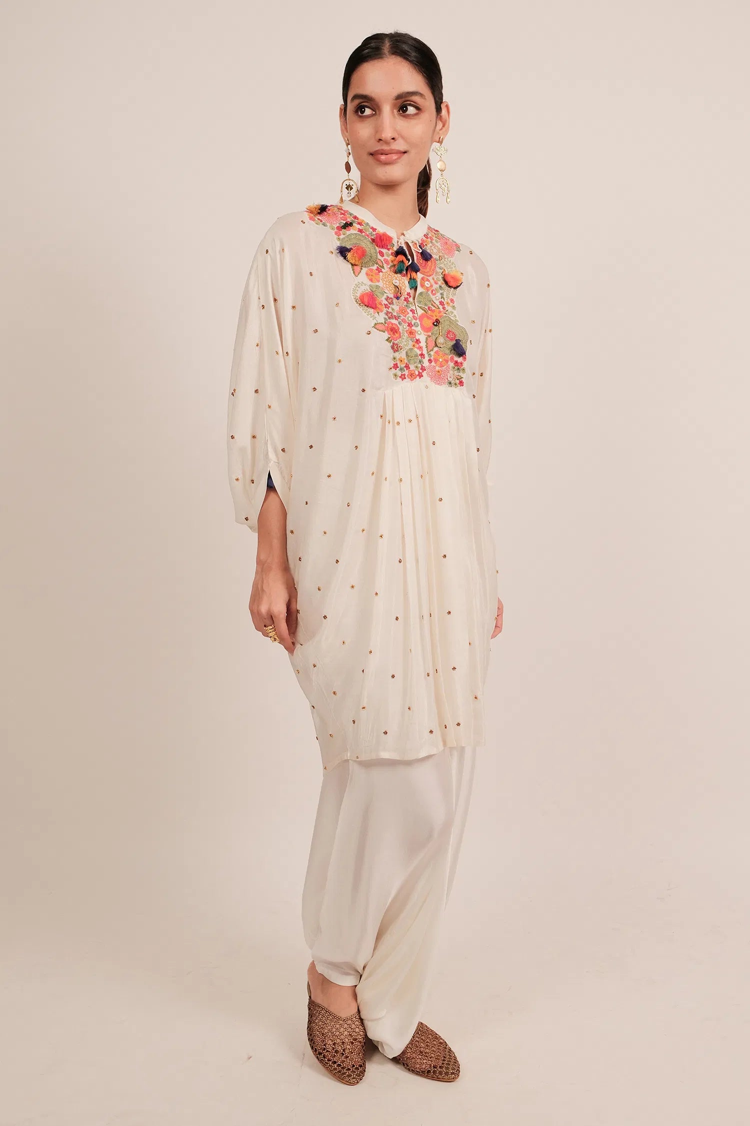 Embrace serene elegance with our Pearl White Silk Kaftan-Style Top, a dreamy fusion of soft hues and artisanal detail—designed for relaxed days and refined gatherings.