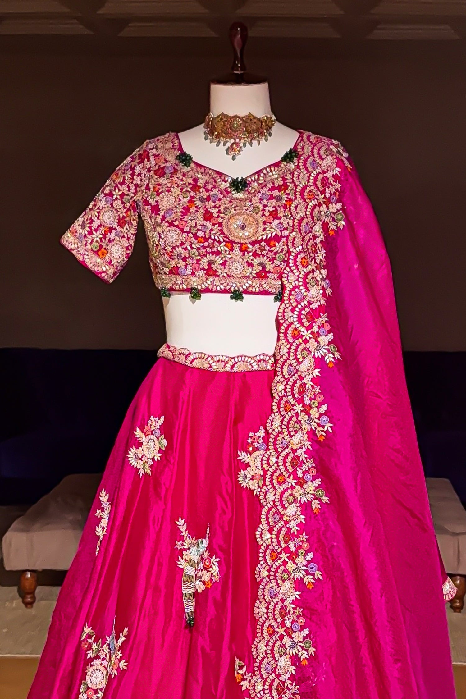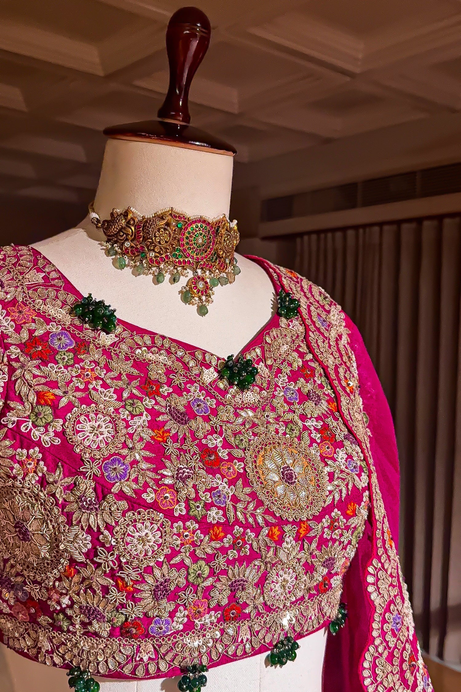 This stunning pink organza lehenga features exquisite zardosi and bead embroidery, highlighted with intricately crafted peacock motif buttas. The rich, flowy skirt pairs beautifully with the matching embroidered blouse for a regal, festive look. A delicately embellished dupatta completes the ensemble, adding elegance and traditional charm. Perfect for weddings, engagements, and grand celebrations.