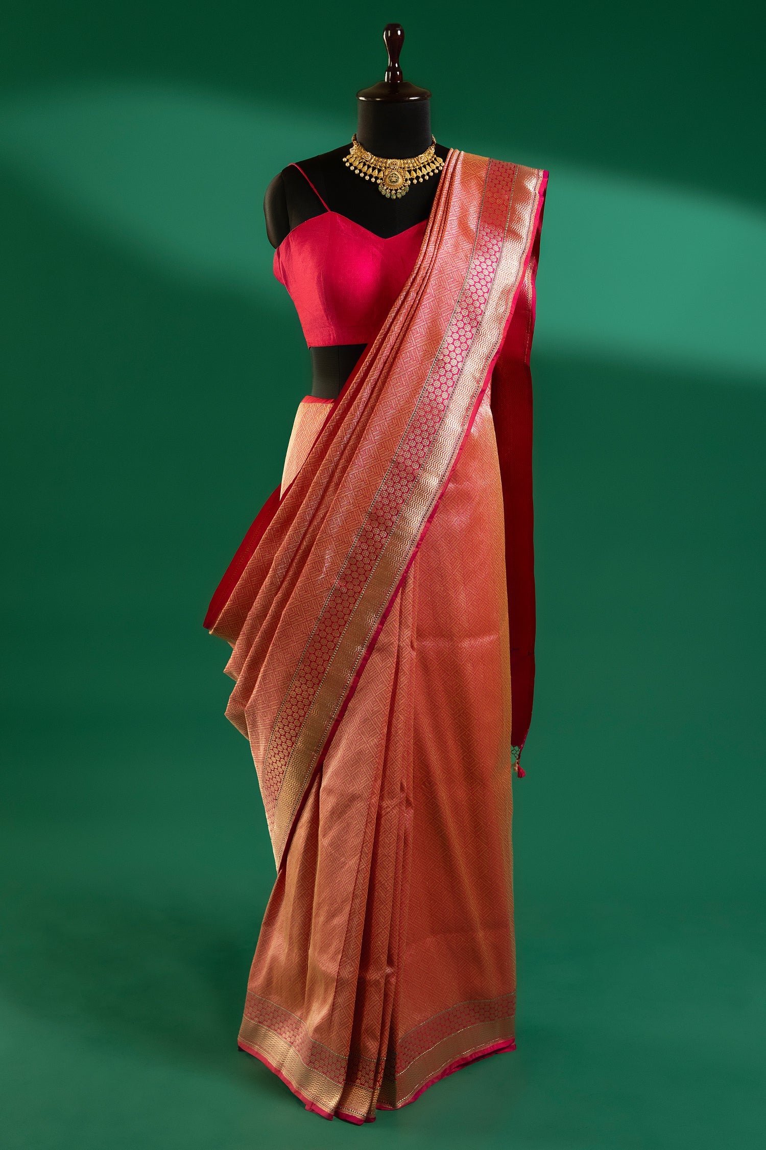 Elevate your festive wardrobe with this exquisite pink silk saree, crafted to embody timeless charm and refined sophistication. The luxurious silk base features intricate traditional weaving throughout, creating a rich interplay of texture and sheen. Its beautifully detailed border, highlighted with delicate geometric and heritage-inspired motifs, adds depth and grandeur to the drape. Complete with an unstitched blouse piece, this ensemble exudes unmatched luxury and refined elegance.