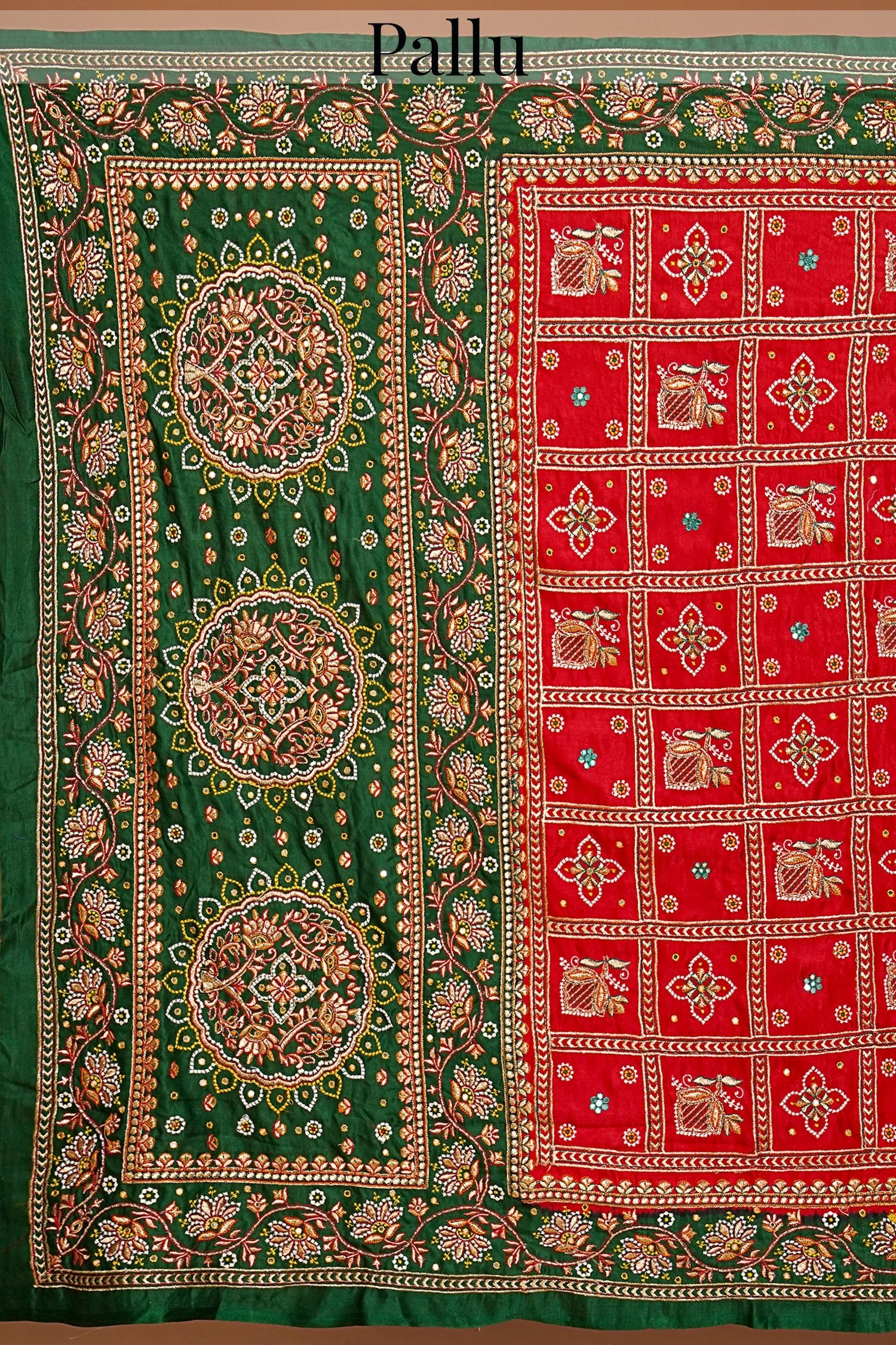 Embellished with intricate resham threadwork and delicate mirror accents, the saree’s borders and pallu exude festive charm. The gold detailing enhances the red base with timeless bridal appeal.