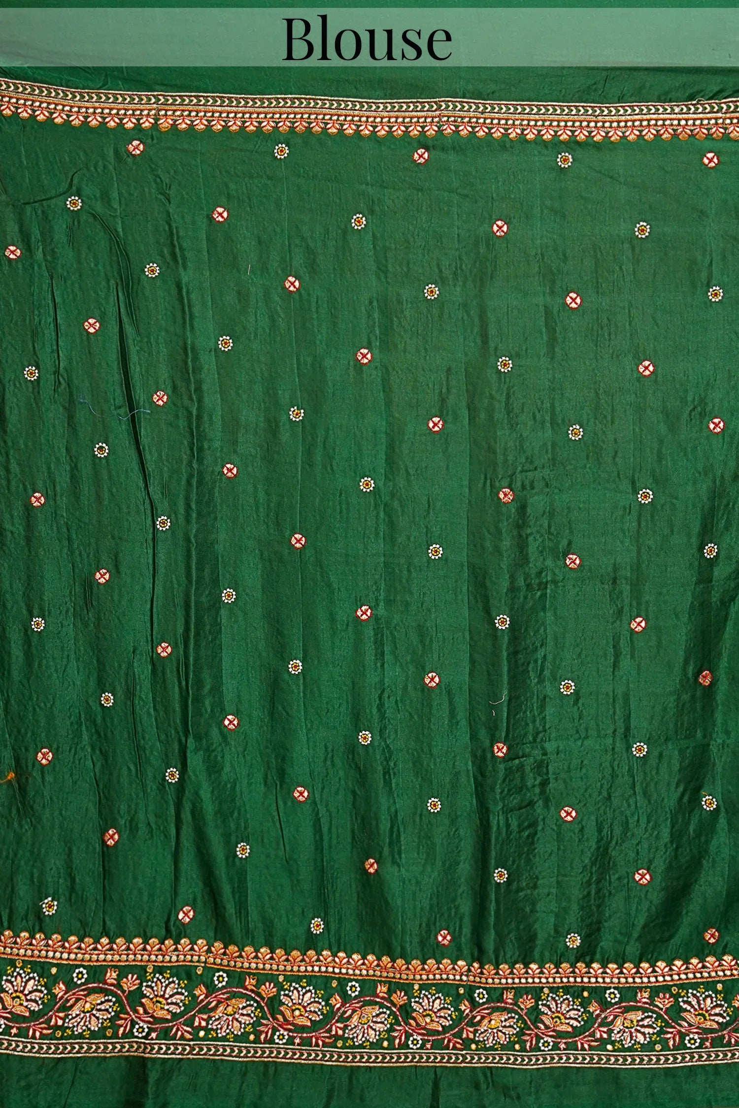 Crafted from rich silk, the saree features classic Gharchola checks in gold zari—each square symbolizing blessings and prosperity. The luxurious texture offers a structured drape ideal for bridal elegance.