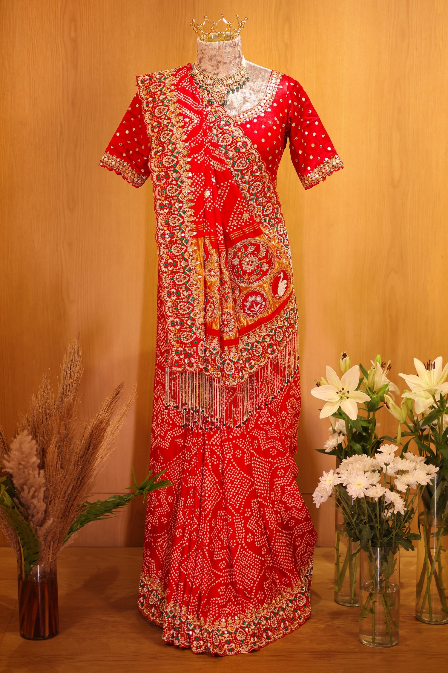 Celebrate tradition with our Red Gaji Silk Bandhej Saree, exquisitely crafted with authentic bandhani patterns.The rich gaji silk fabric drapes beautifully, while intricate handwork adds a luxurious touch to the ensemble.A highlight of this saree is the stunning beaded fringe lace, bringing graceful movement and a statement finish.Perfect for weddings, festivals, and grand celebrations, this piece blends timeless artistry with modern elegance.