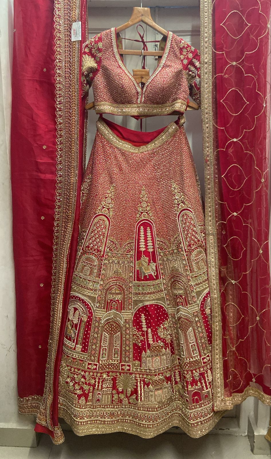 This exquisite red Matka silk bridal lehenga showcases intricate zardosi, resham, and sequinned architectural motifs that lend it a regal, heritage-rich appeal. The heavily embellished blouse enhances the ensemble with its luxurious handwork and refined detailing. It is paired with two dupattas—one crafted in soft net and the second in elegant organza—each arranged in a refined drape to elevate the overall bridal charm. The opulent craftsmanship and classic red palette make it a perfect choice for traditional wedding ceremonies.