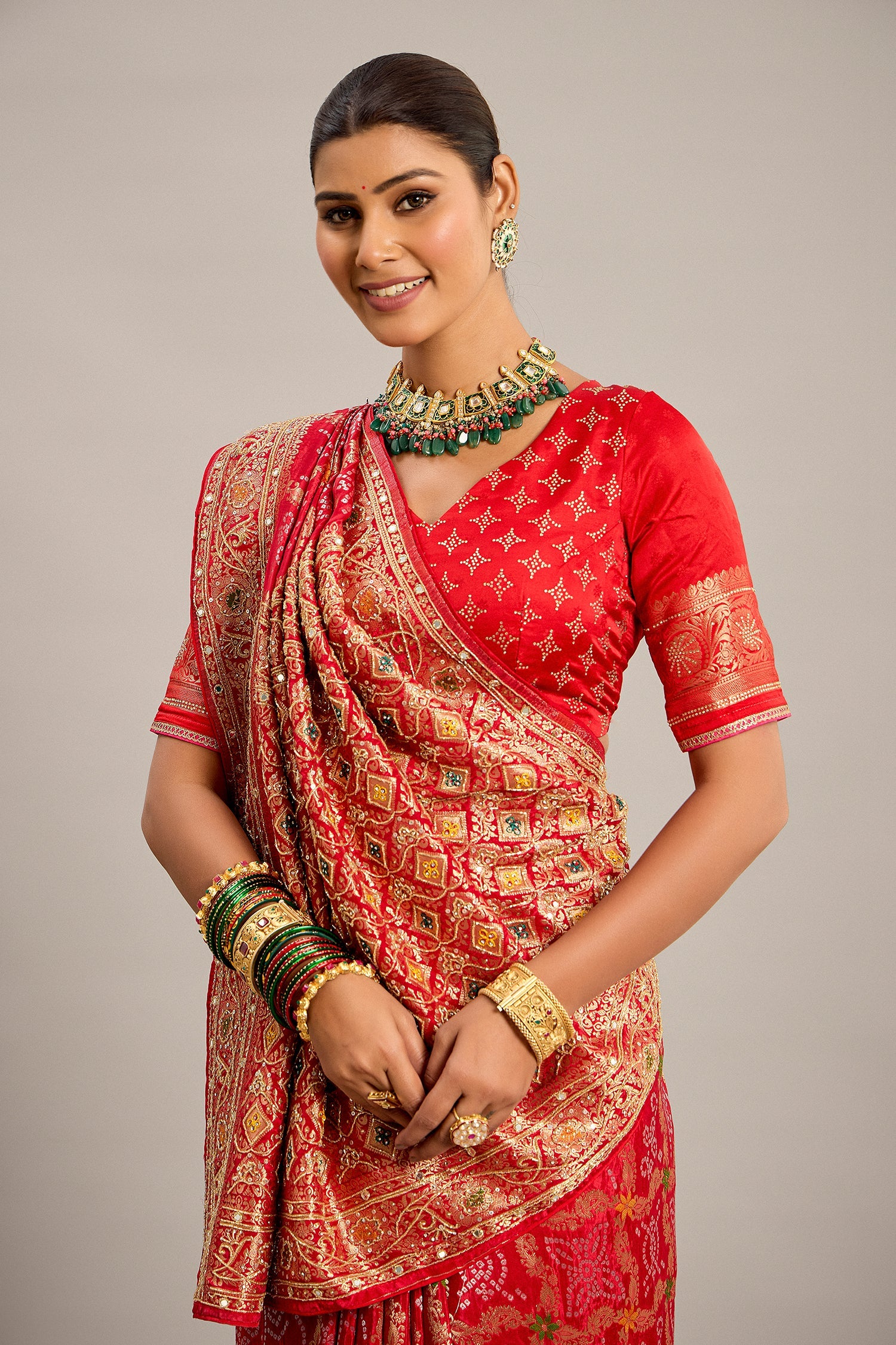Crafted in breathable satin-georgette, this saree features vibrant Bandhej tie-dye patterns in a rich red hue. The fabric’s smooth drape and understated sheen enhance its festive appeal.