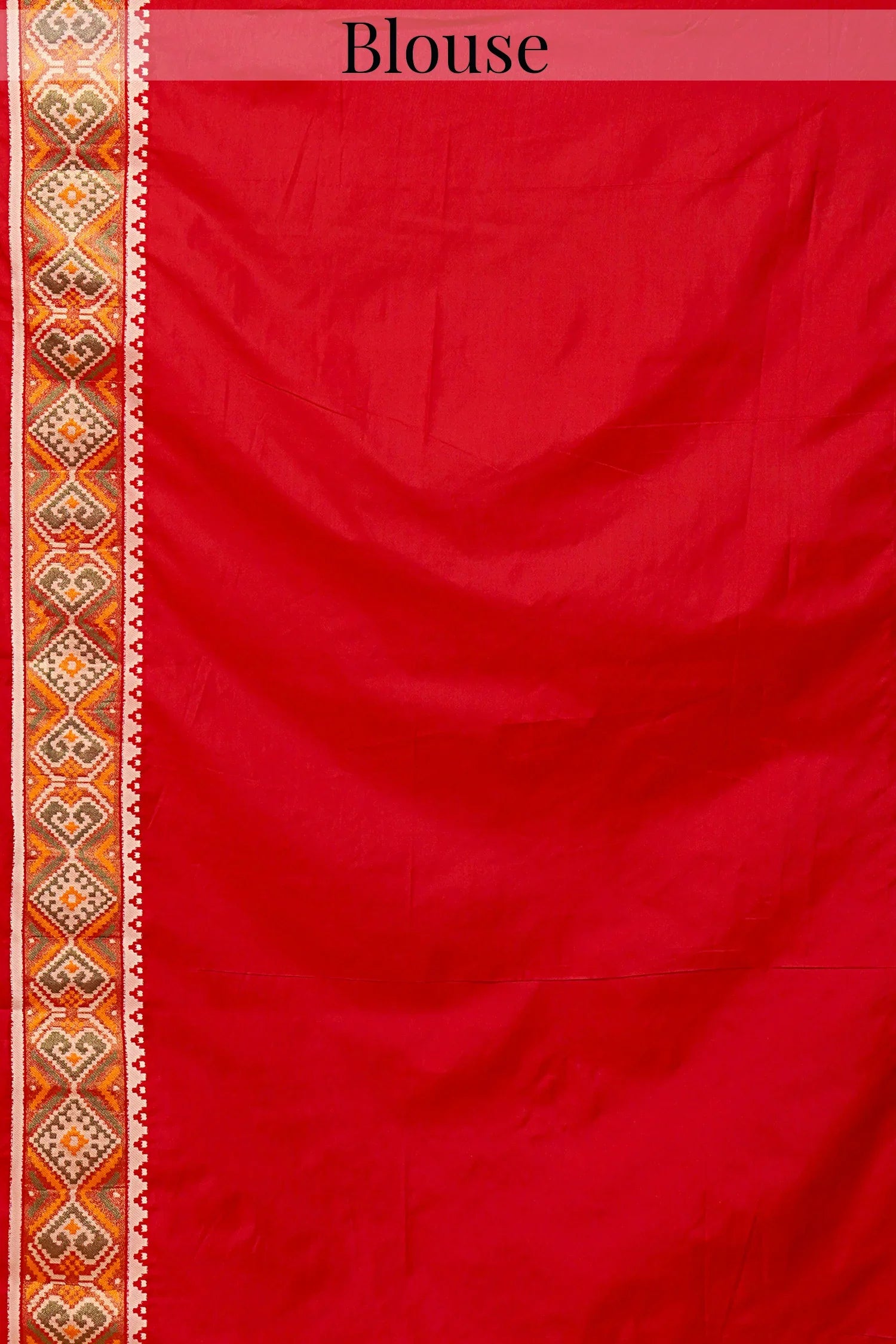 The saree features rich red silk adorned with classic Patola motifs—floral and geometric patterns woven seamlessly into the fabric—creating a visual narrative of tradition and elegance.