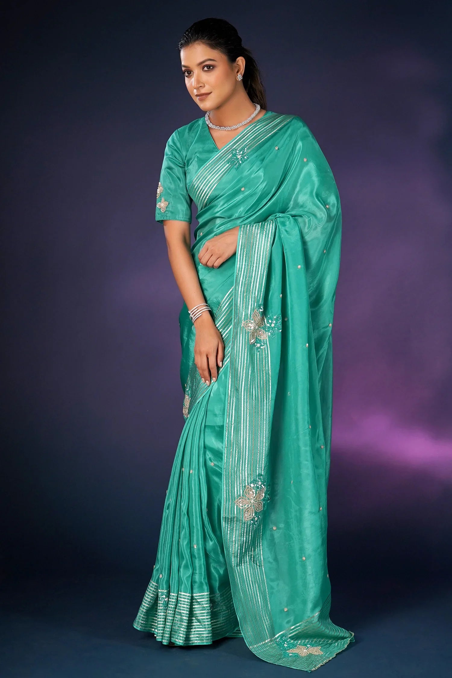 Wrap yourself in light luxury with our Sea Green Tissue Silk Saree, bordered with shimmering sequins. Ideal for day receptions, festive functions, or evening soirees when you want to shine subtly.