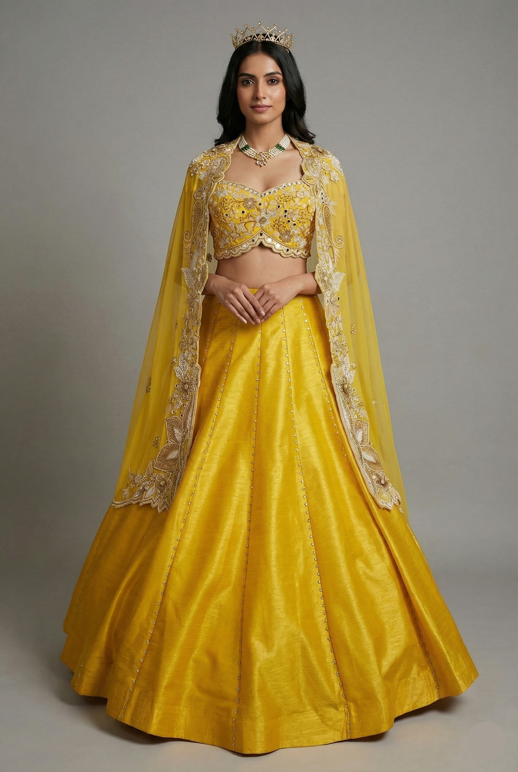 Drenched in a radiant shade of sunshine yellow, this lehenga set exudes festive brilliance. The raw silk skirt flows in rich, structured panels embellished with delicate bead highlights, creating a graceful, royal flare. Its intricately beaded crop top adds a refined sparkle, while the embroidered sheer shrug completes the look with soft elegance and couture charm. A stunning choice for haldi celebrations, daytime festivities, or modern wedding functions.